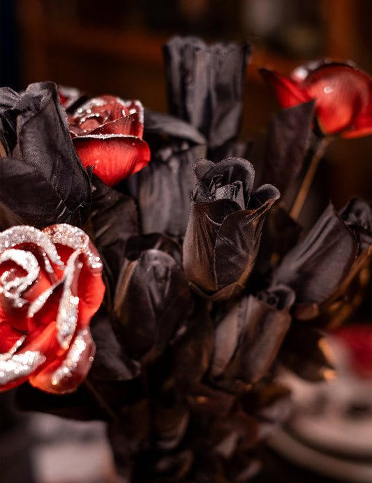 Kytice červených růží s pavučinovou strukturou 35 cm Halloween