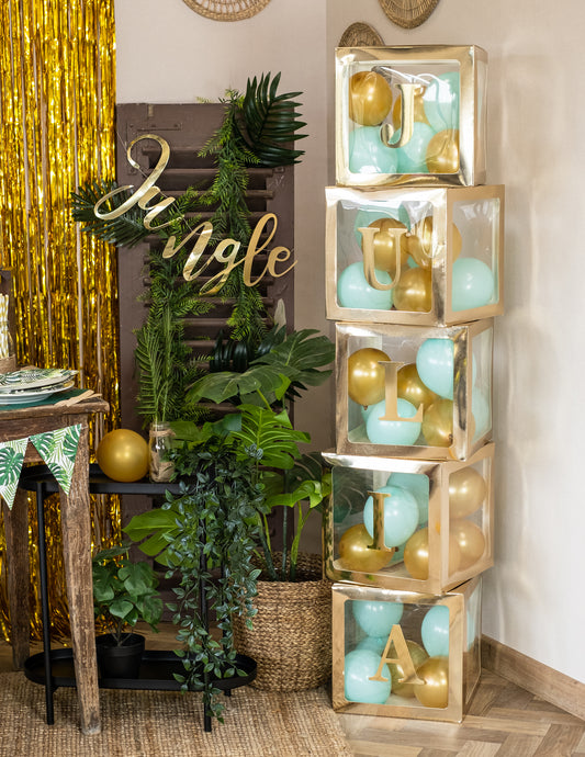 Zahrnuto: 30 balónků po 25 kusech cm, 38 balónků po 13 kusech cm, 2 balónky po 30 kusech cm, 4 tropické listy, 1 samolepicí proužek, 1 5m vázací páska