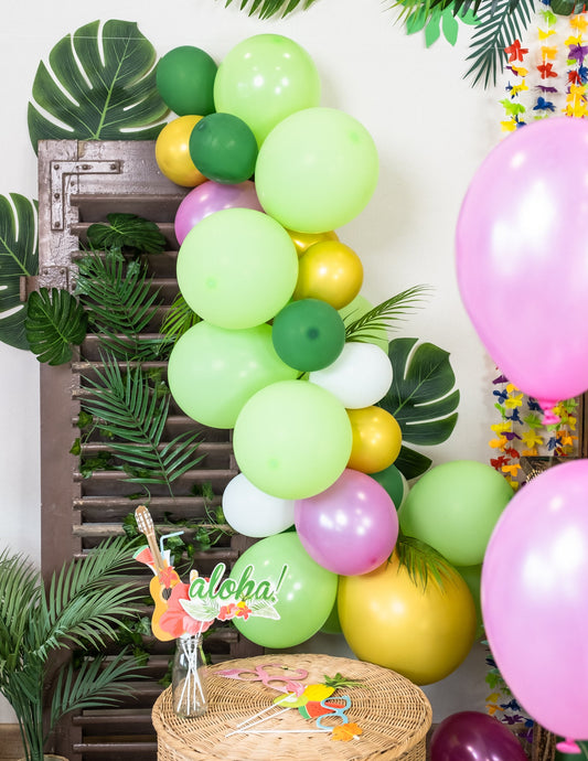 Včetně : 30 balónků po 25 kusech cm, 38 balónků po 13 kusech cm, 2 balónky po 30 kusech cm, 4 tropické listy, 1 samolepicí proužek, 1 5m vázací páska