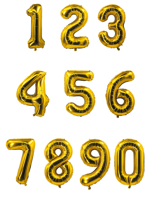 - Zlaté nebo růžové zlaté číselné balónky na oslavu milníkových narozenin.
