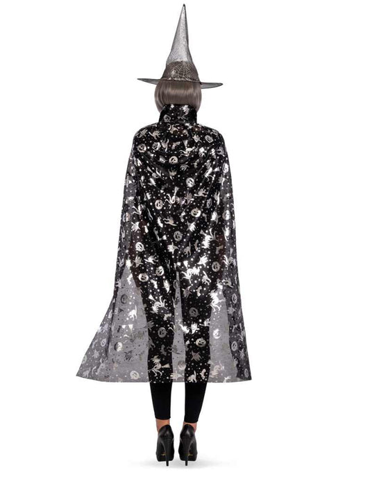 Dámská černo-stříbrná sada čarodějnického klobouku a pláště