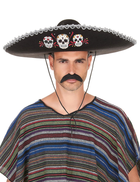 Černá Dia de Los Muertos Sombrero se stříbrným povrchem pro dospělé