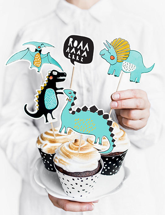 5 modrých kartonových ozdob na dort s dinosaury 10,5 - 20 cm