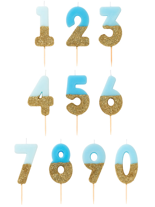 AkceSvíčka na špejli modrá a zlatá třpytivá čísla 13.8 cm na dort