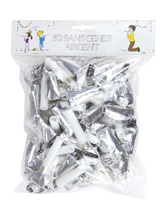 6 stříbrných kartonových foukacích pistolí 18 x 1,8 cm