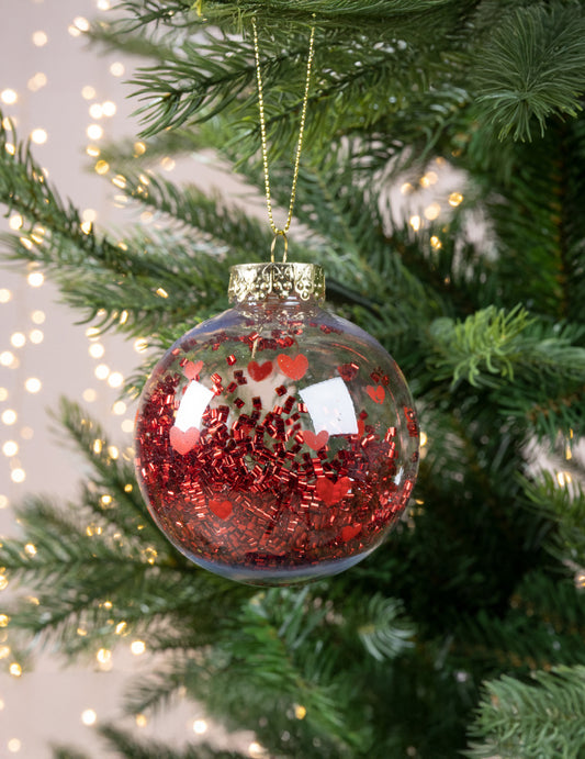 Průhledná vánoční koule s červenými srdíčky a konfetami 8 cm