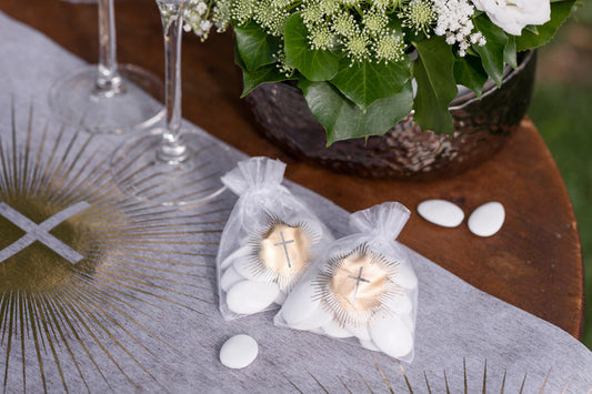 6 zlatých slavnostních bílých organdových sáčků s křížem 7,5 x 10 cm