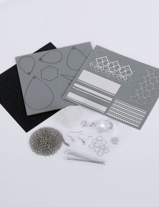 Včetně : 1 šablona, tvary šperků z šedého kartonu , Tvary šperků z černého kartonu , 1 mini dávka bílé barvy , 1 m řetězu , 10 spojovacích hřebíků , 2 spony , 10 zlomených prstenů , 1 pár náušnic , 1 držák na prsten , 20 krimpovacích korálků , 1 ilustrovaný návod k obsluze