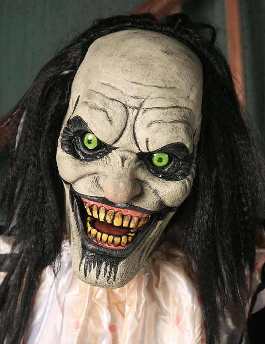 AkceAnimovaná dekorace Děsivý klaun s visícím dítětem s pohyby a světly 2,15 m