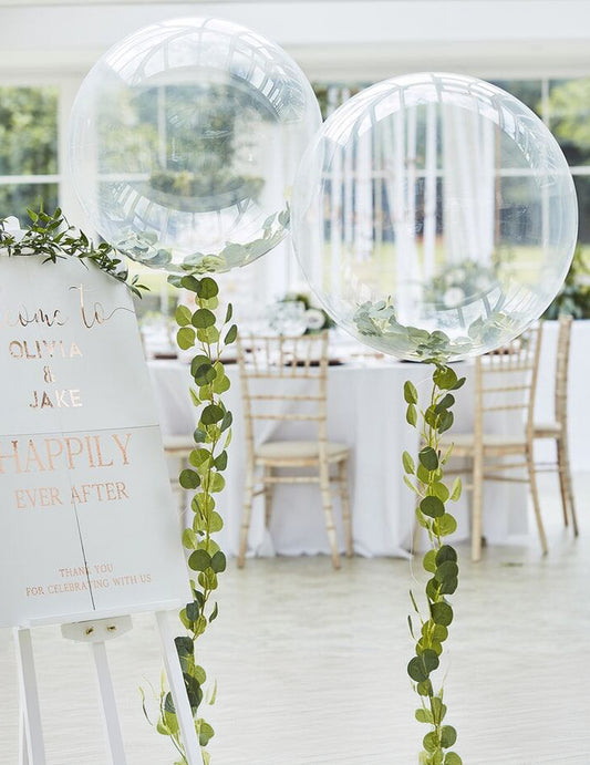 VyprodánoPrůhledný bublinkový balónek s girlandou z listů 90 cm přírodní svatba