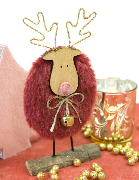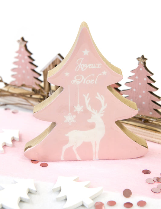Dřevěná dekorace jedle a sob růžový smaltovaný vzhled 10 x 11 cm