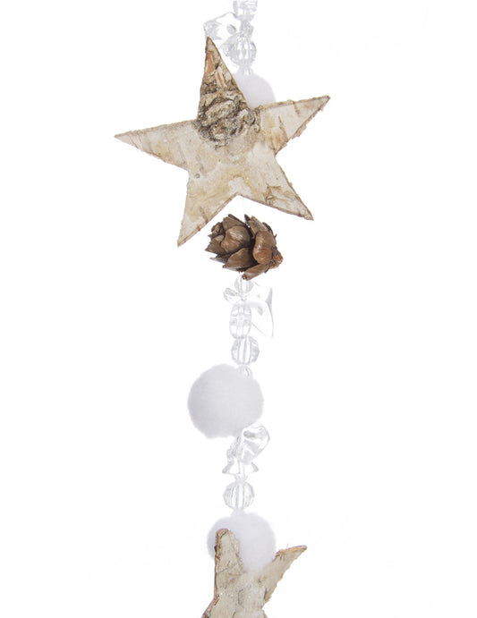 VyprodánoDřevěné girlandové hvězdy a vatové kuličky 140 cm s šiškami