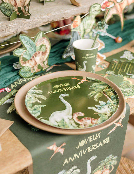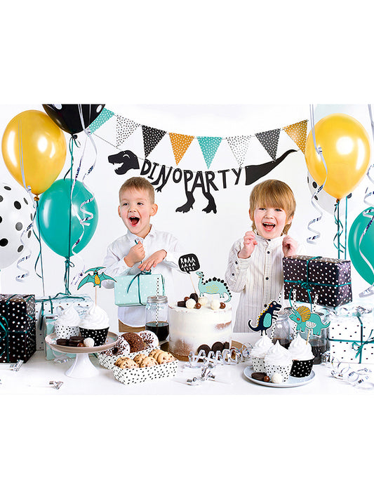 Včetně : 5 dřevěných trsátek s dinosaury, 10 brček , 6 Bez jakýchkoli rozpaků , 1 stuha , 1 Hadí , 2 obdélníkové kontejnery , 6 forem na muffiny , 1 girlanda s praporkem , 1 girlanda s dinosaurem na párty , 6 balónků
