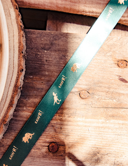 VyprodánoSaténová stuha s dinosauřím vzorem a RAWR! zelená flákovaná zlatá 1,9 cm x 10 m