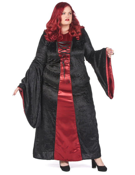 Dámský gotický kostým s kapucí v červené a černé barvě pro větší děti