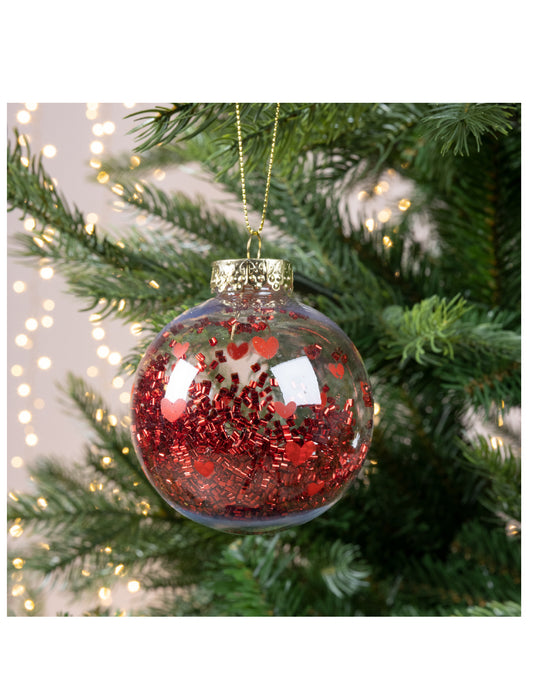 Průhledná vánoční koule s červenými srdíčky a konfetami 8 cm
