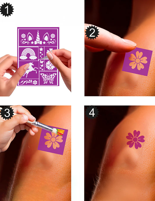 Včetně : Barva na obličej , Aplikátory , Houba , Tužka , Dočasné tetování na obličeji , Samolepka na šperky