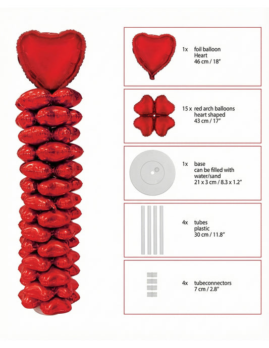 Včetně : 1 balónek ve tvaru srdce , 15 kruhových balónků ve tvaru srdce , 1 základna , 4 trubice s konektory