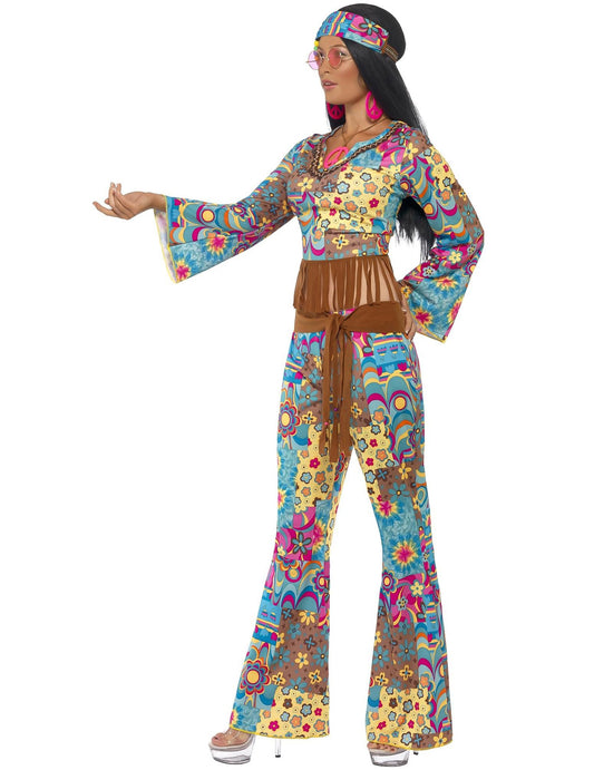 Kostým hippie pro ženy je klasika, která nikdy nevyjde z módy. Tento kostým, symbol éry hippies a hnutí „peace and love“, je ideální pro oživení psychedelické atmosféry 60. a 70. let. Kostým obecně zahrnuje barevný a květinový outfit, s třásněmi nebo tunikou a zvonem kalhoty do zvonu. Květinové vzory, světlé barvy a materiály jako samet se často používají k obnovení stylu éry.