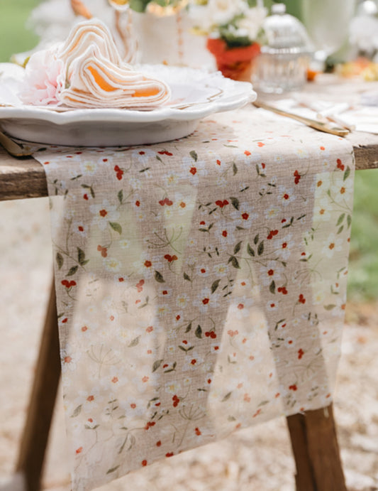 Béžový, bílý, zelený a broskvový látkový běhoun 26cmx5m s květinovými vzory