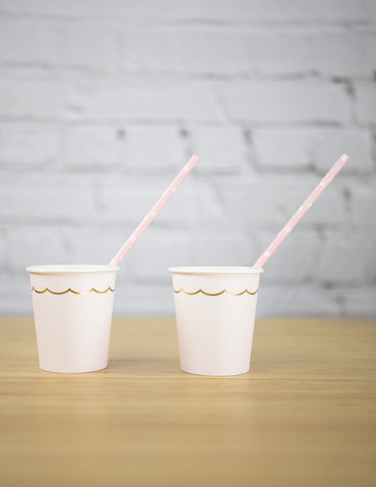 Vyprodáno8 vroubkovaných kartonových kelímků v pastelově růžové a zlaté barvě, 200 ml