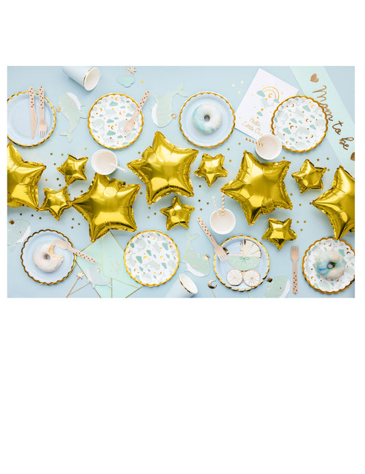 6 malých nebesky modrých papírových talířů 18 cm se zlatými okraji