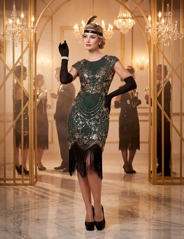 Luxusný dámsky charlestonový kostým v čiernej a zlatej farbe so flitrami