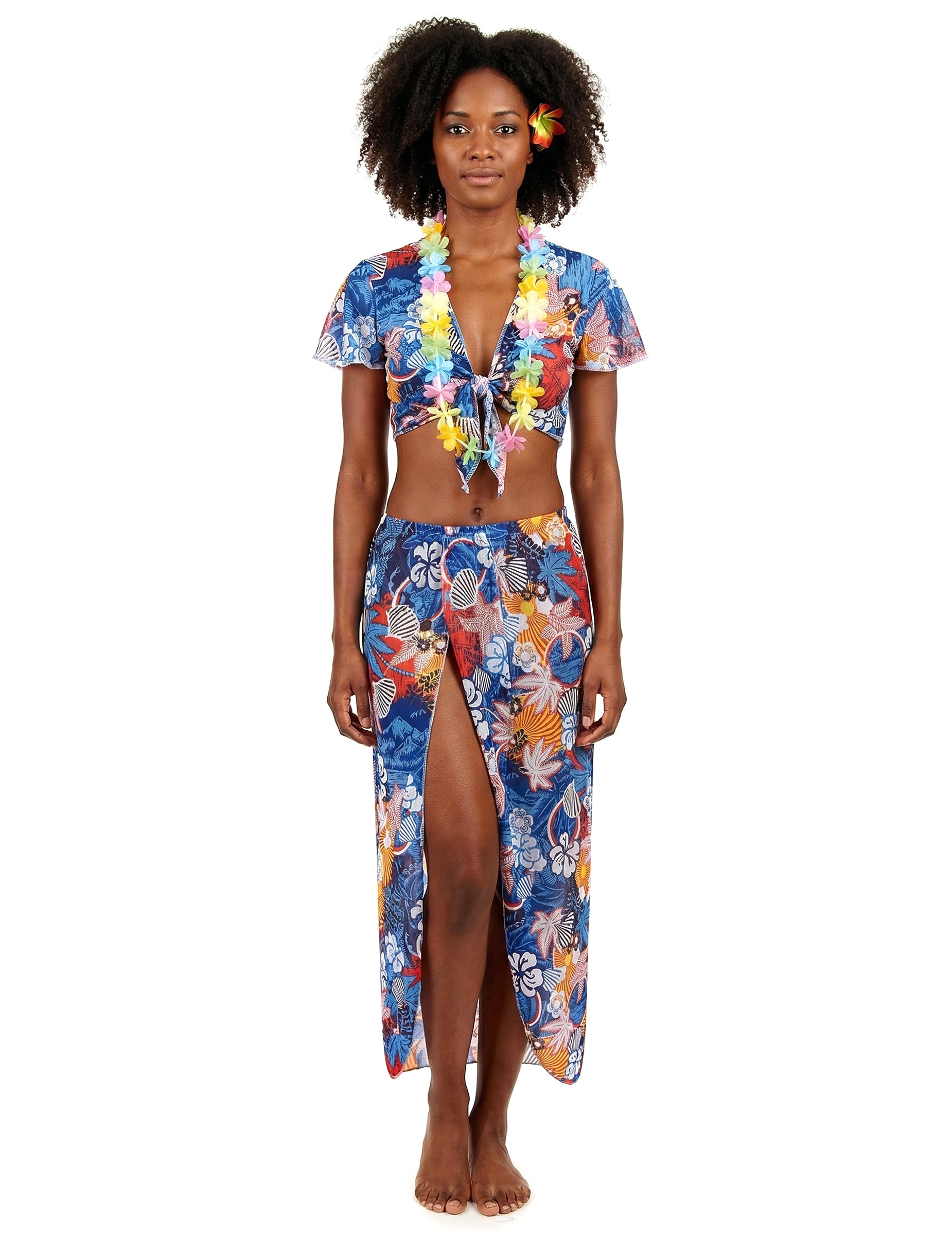 Urlauberinkostüm Hawaii fürDamen, bestehendausBluse, Rock, Blumenkette und Blumenhaarschmuck. Das perfekte Ensemble fürHawaii-Mottopartys. Einheitsgröße. (40-42)