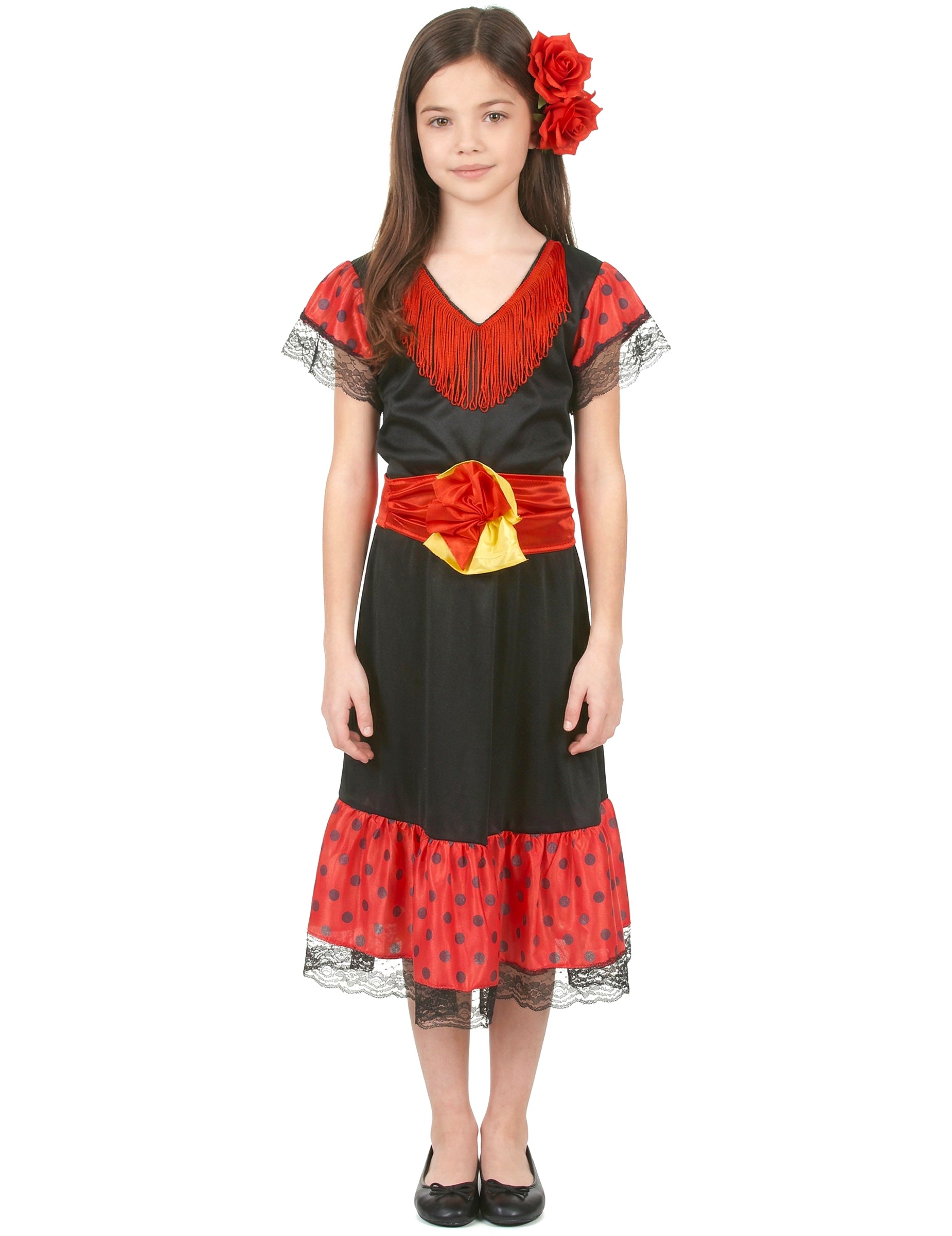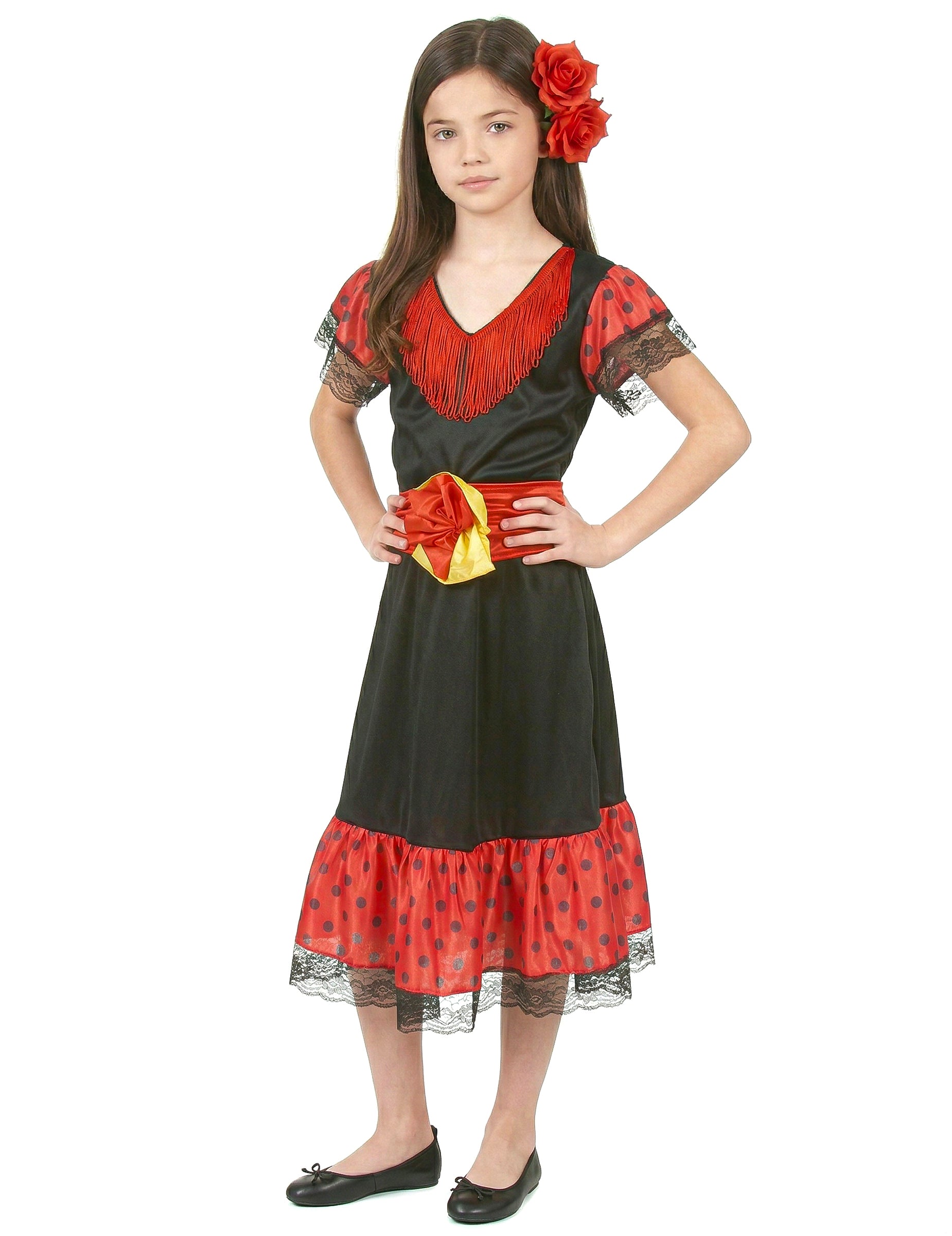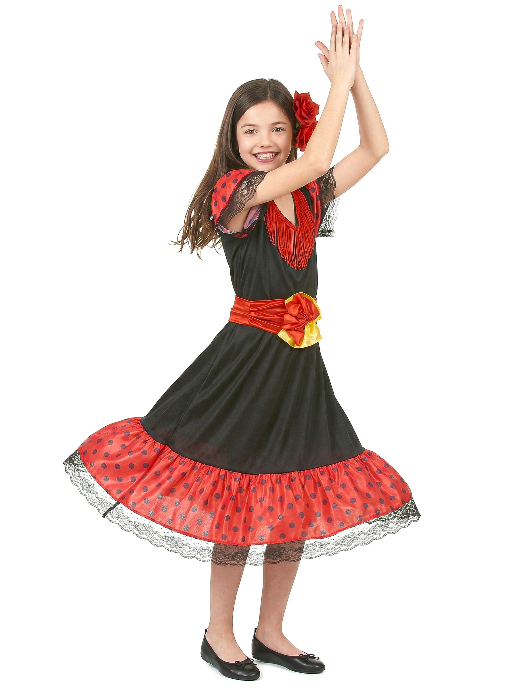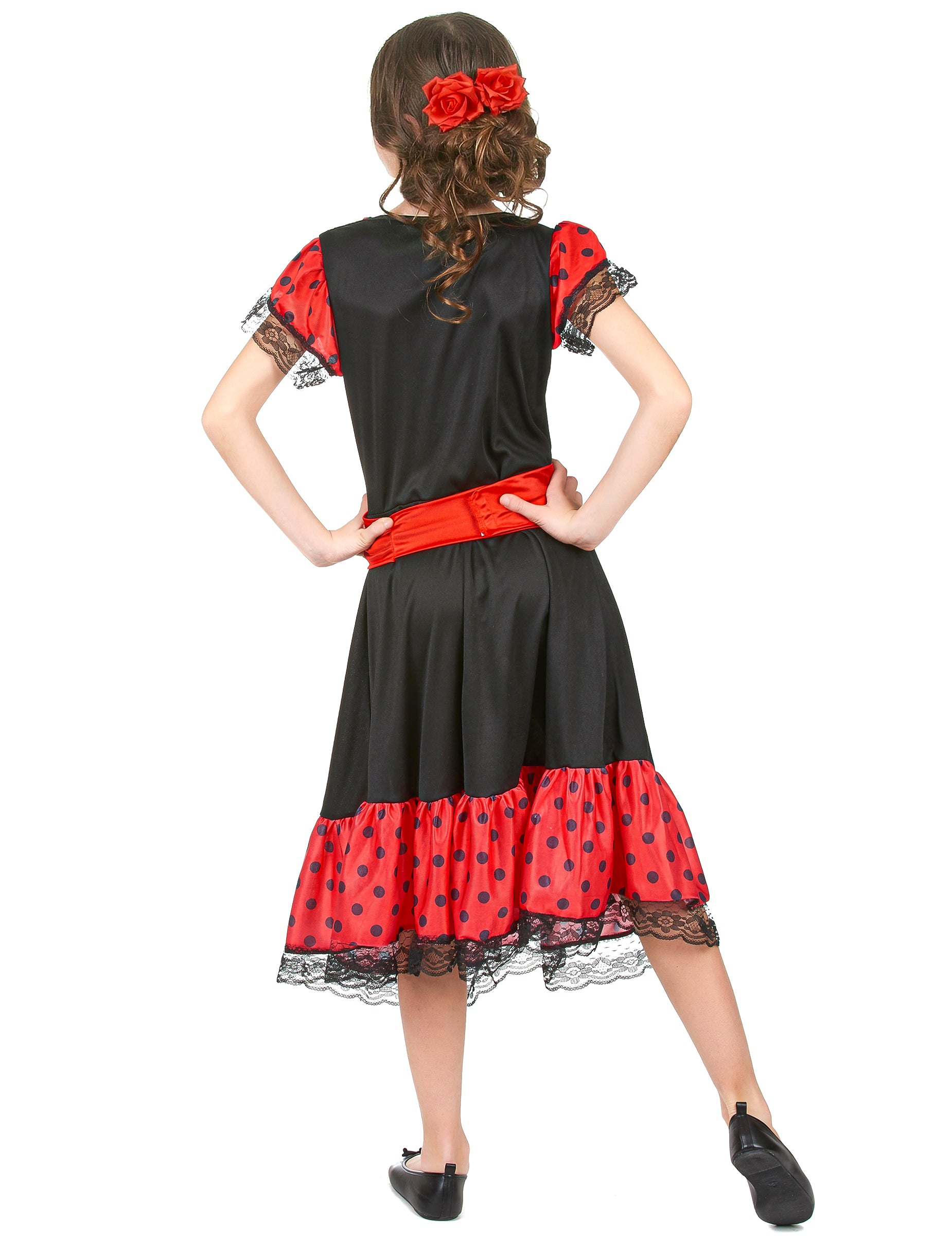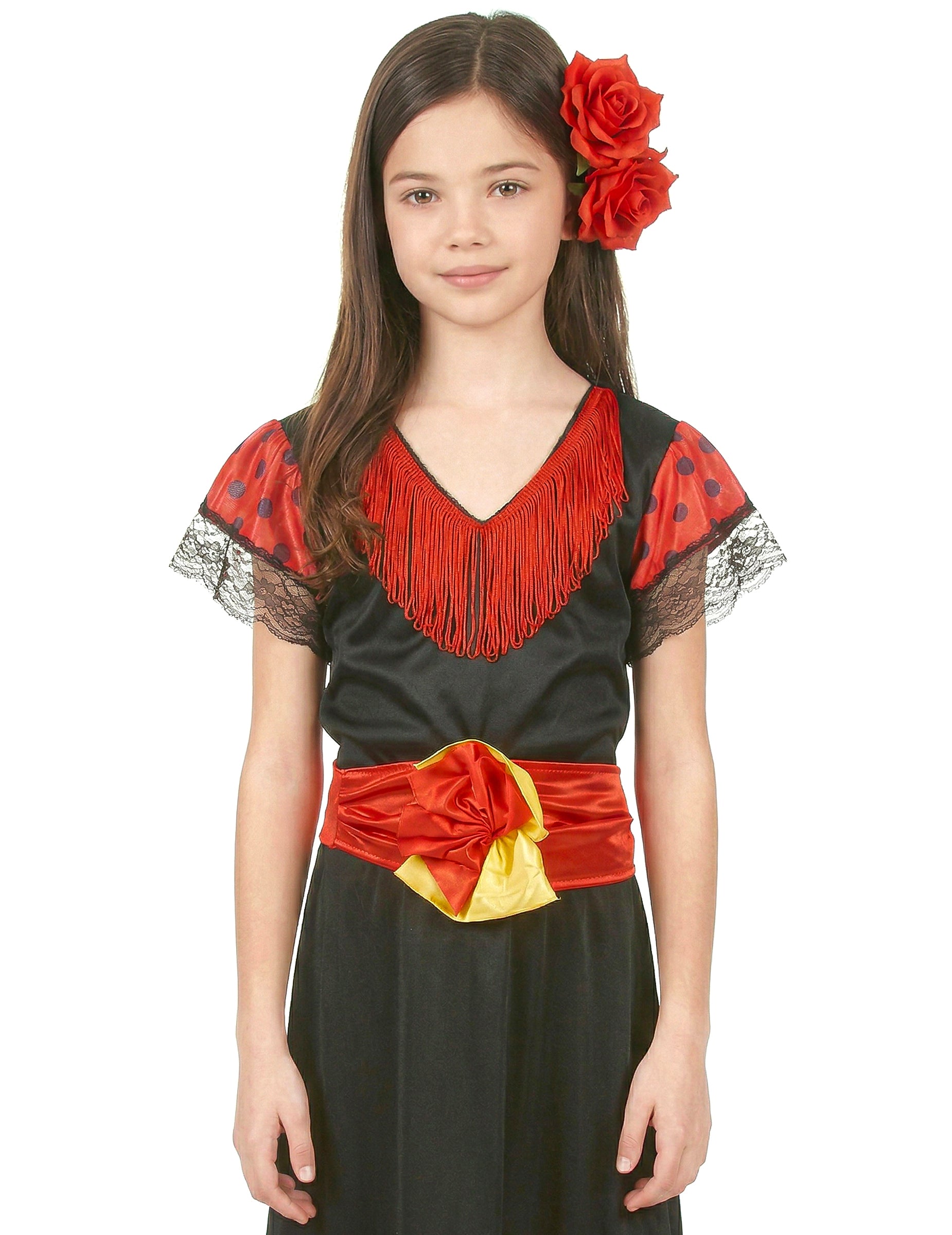 Spanisches Flamenco-Kostüm für Mädchen, bestehend aus einem rot-schwarzen Kleid, einem Gürtel und einem Haarreif (Schuhe und Fächer nicht inbegriffen). Perfekt für Kostümpartys, Geburtstagsfeiern, Events.