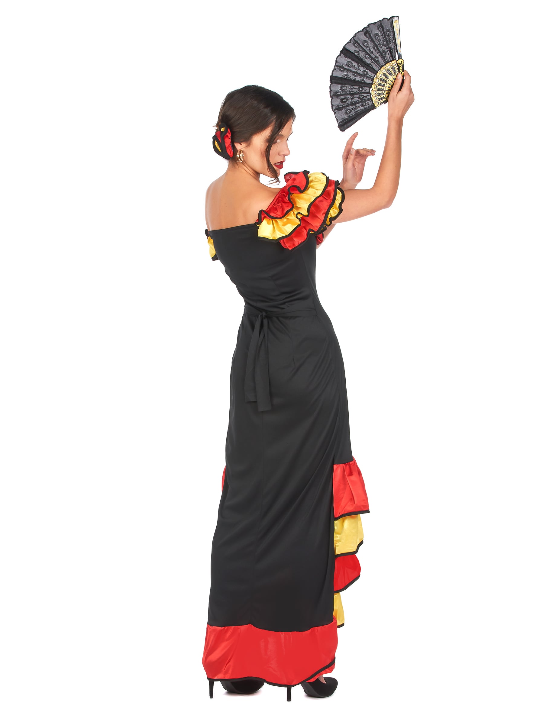 Damenkostüm Flamencotänzerin, bestehend aus langem schwarzem Kleid mit roten und gelben Voloants und einer dazu passenden Blume als Haarschmuck. (Schuhe und Fächer nicht inbegriffen)