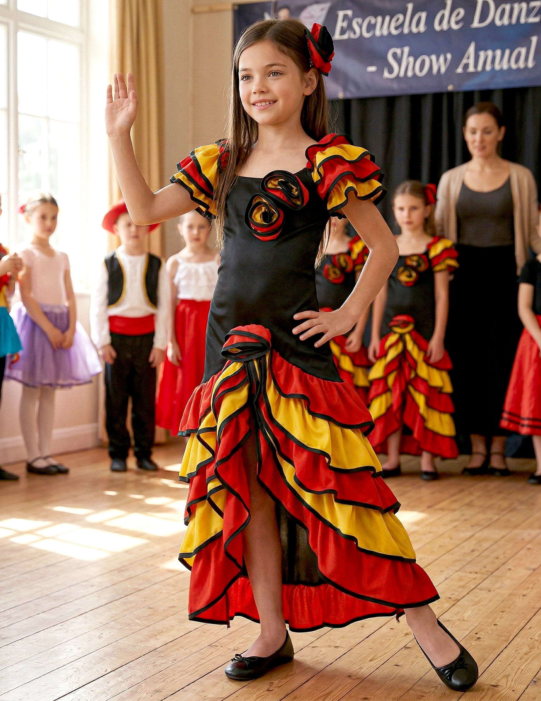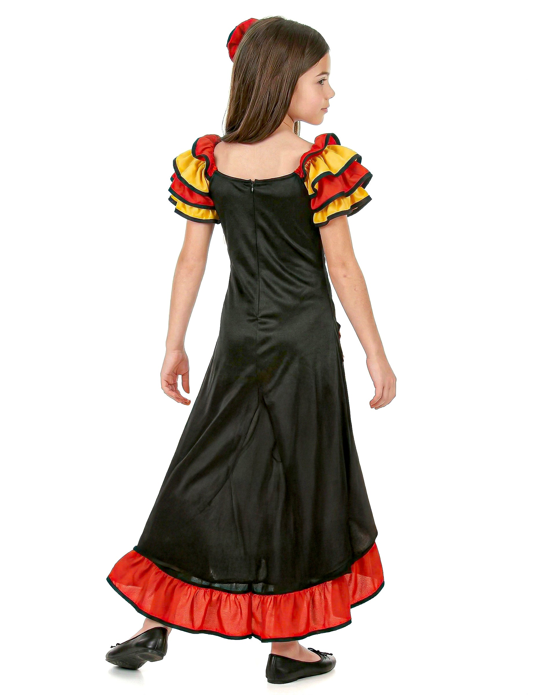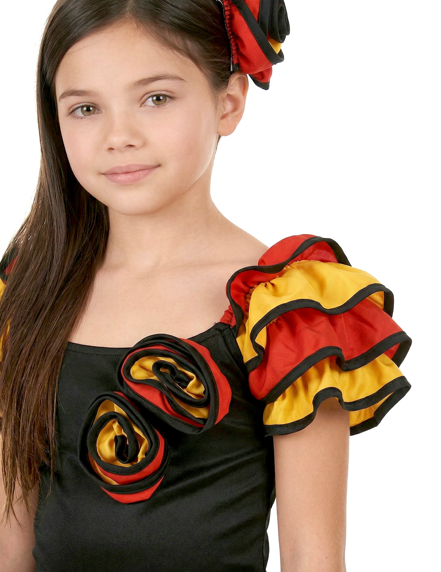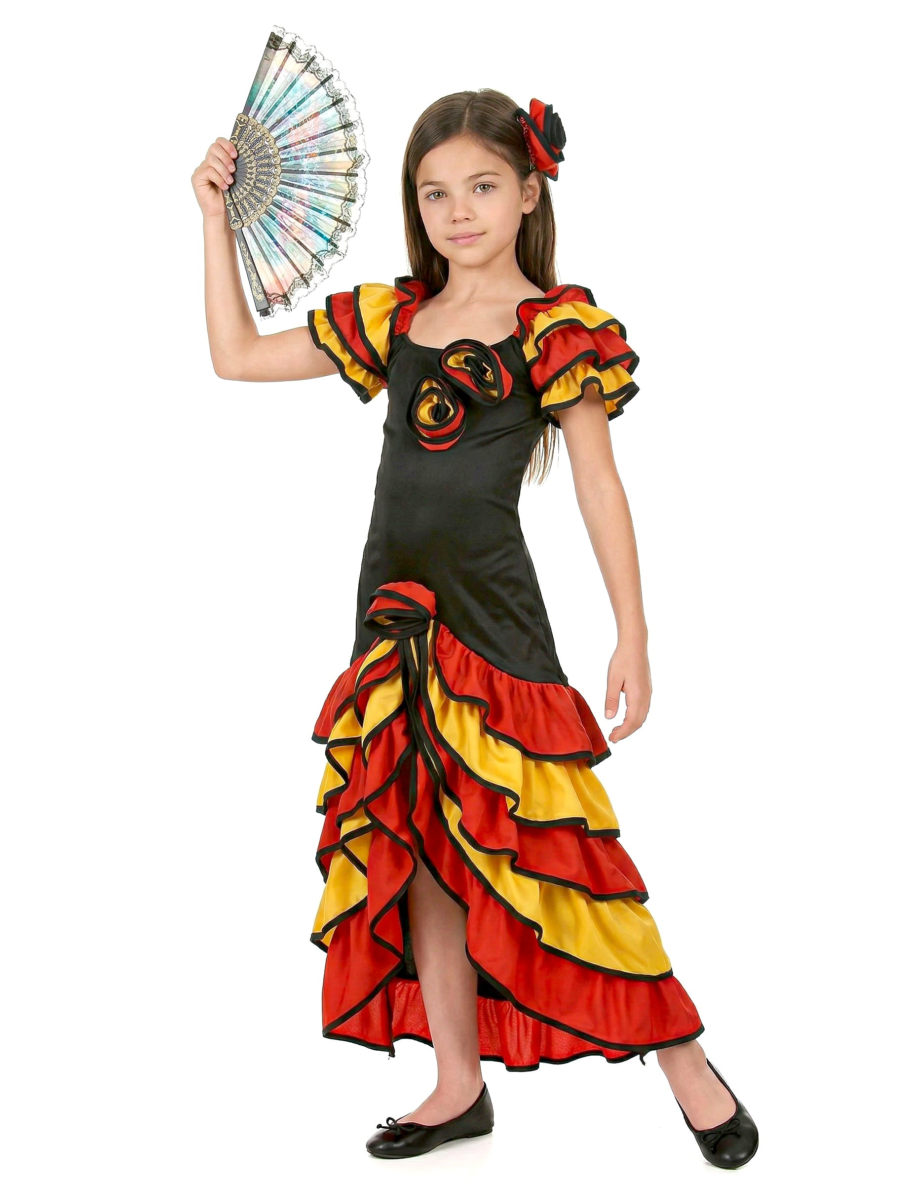 Kostüm Spanische Tänzerin für Mädchen, bestehend aus einem langen Kleid mit Schlitz und einer Haarspange mit einer Stoffrose. Schwarzes Kleid mit gelben und roten Rüschen und vorne aufgenähten Stoffrosen. (Ohrringe und Schuhe nicht inbegriffen) Diese Verkleidung als Spanische Tänzerin ist perfekt zum Flamenco