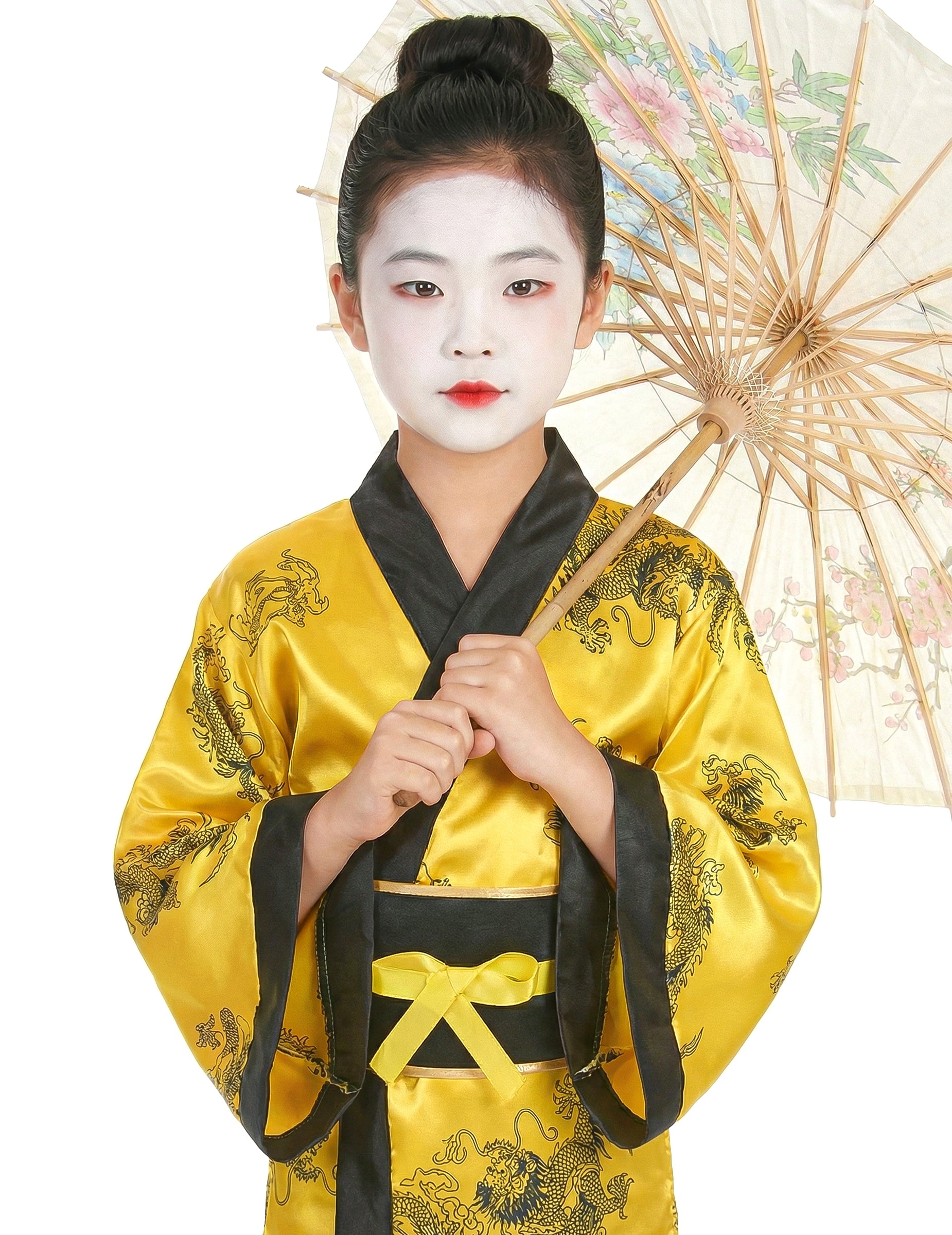 Traditionelles Chinesinnenkostüm für Mädchen, bestehend aus einem langen Gewand mit einem breiten Gürtel. Gelbes Gewand mit Drachenmotiven aus leichtem, satinartigen Stoff. Der Gürtel mit gelbem Band wird im Rücken zusammengebunden (Schuhe nicht inbegriffen). Dieses traditionelle Chinesinnenkostüm ist die perfekte Verkleidung für Geburtstagsfeiern, Karneval und Kostüm