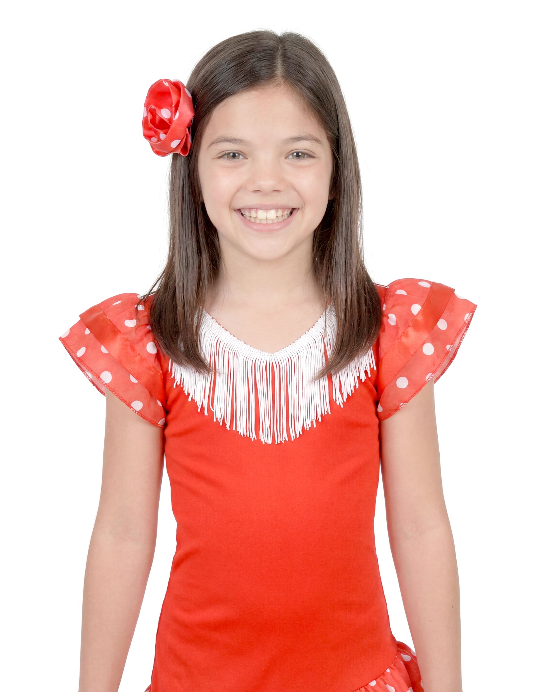 Dieses Flamenco-Tänzerin Kostüm für Kinder kommt mit einem Blütenhaarschmuck (Fächer und Schuhe werden nicht mitgeliefert).