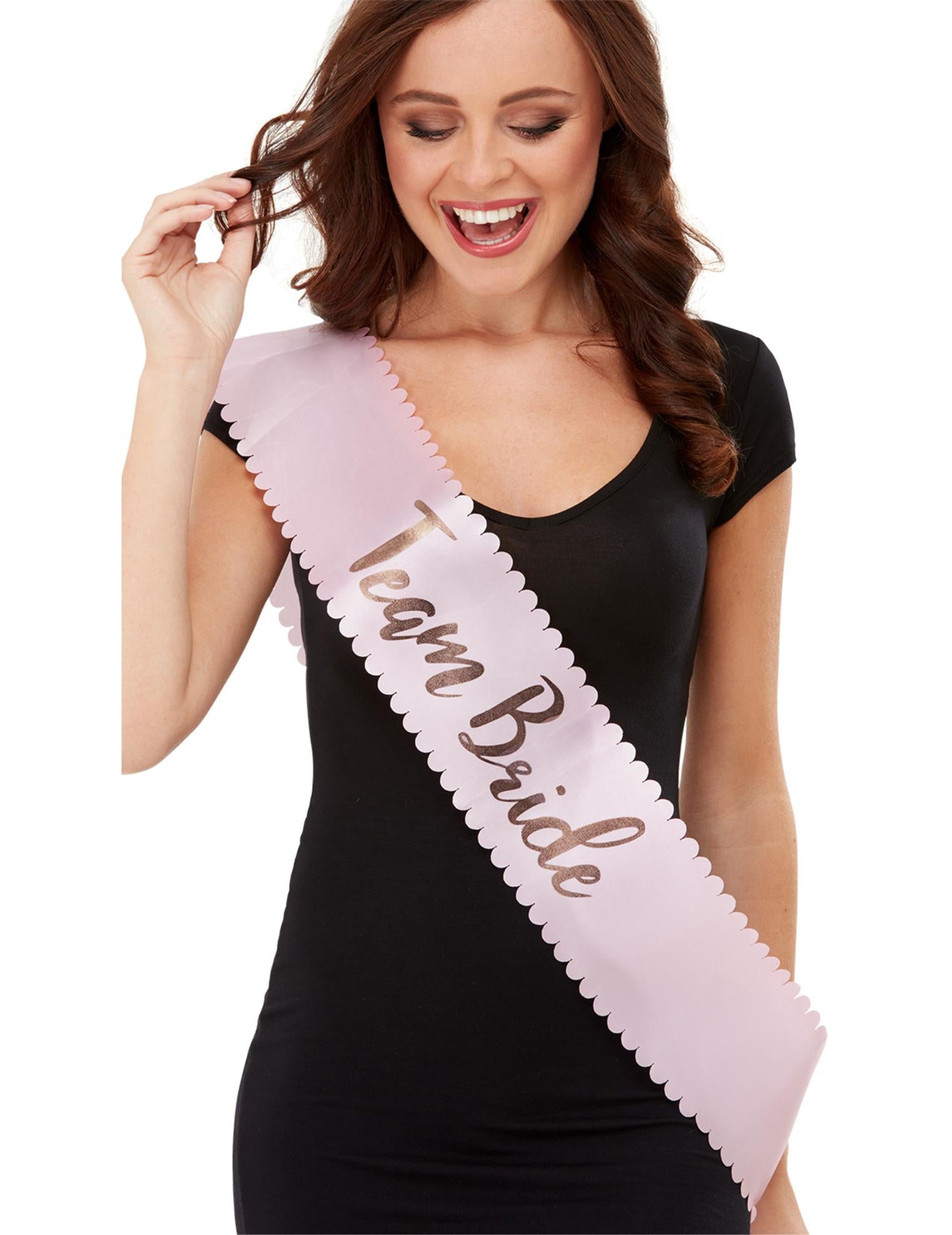 Diese Junggesellenabschieds-Schärpe ist wunderschön rosa gefärbt und passt Erwachsenen. Die JGA-Schärpe besitzt wellenförmige Kanten und die Aufschrift "Team Bride" in goldfarbenen Buchstaben. Mit der Braut-Schärpe sind Sie perfekt für den JGA vorbereitet und begleiten die zukünftige Braut mit Stil!