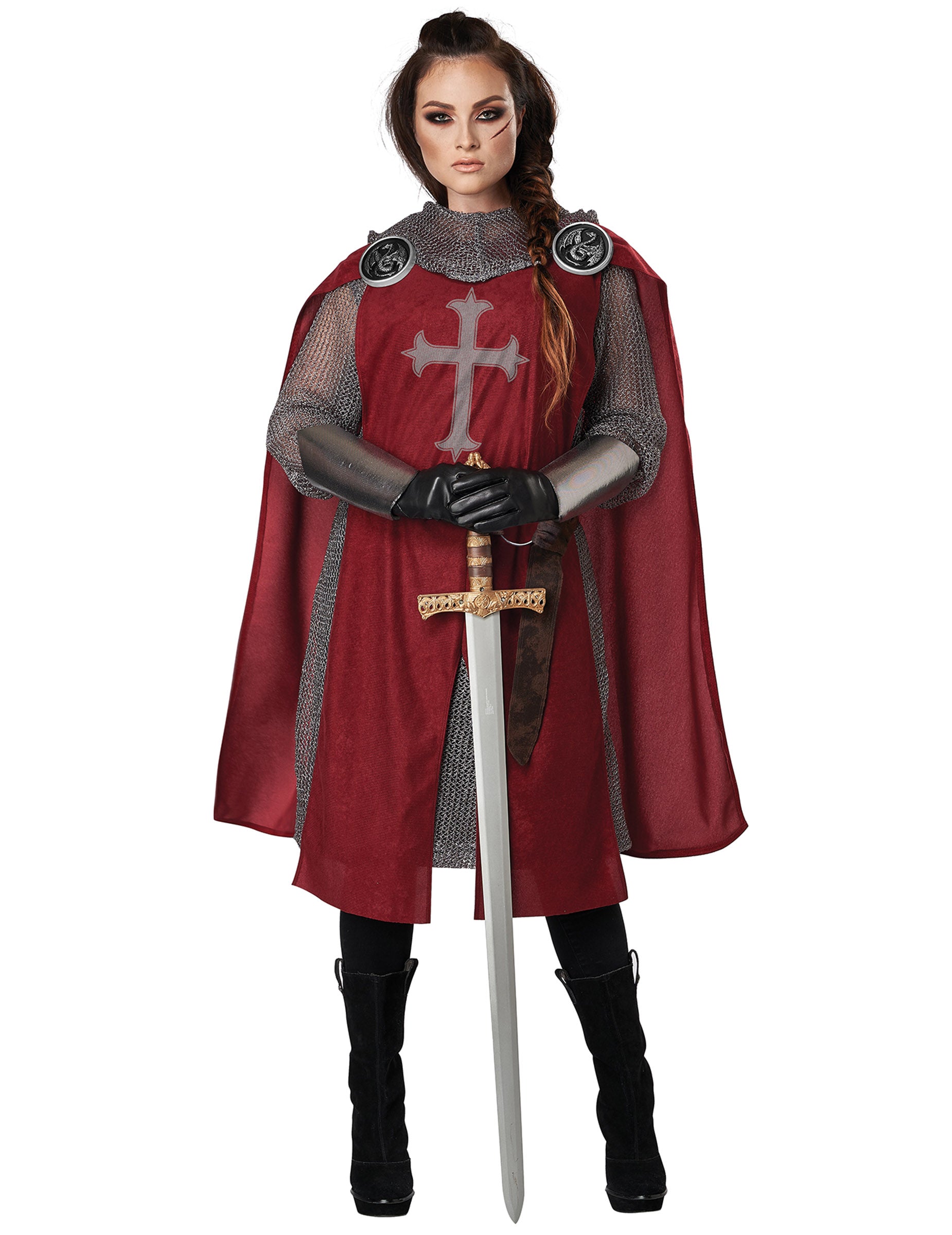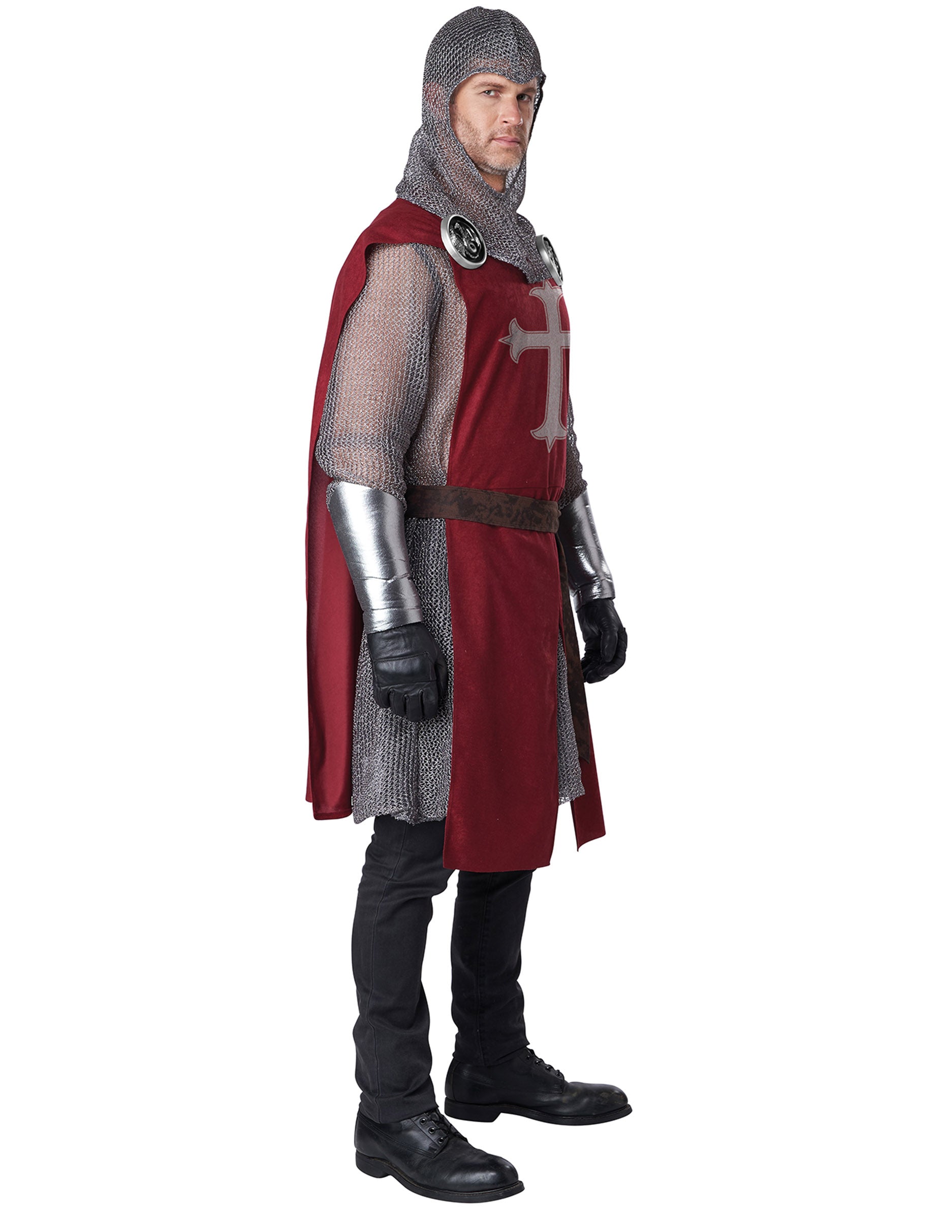 Die Ritter-Tunika ist überwiegend in Rot gestaltet und knielang verarbeitet. Auf der Brust ist ein Kreuz zusehen, welches umgeben ist von 2 Medaillons. Diese wiederum sind mit dem im Lieferumfang enthaltenen Umhang verbunden. Mit den Armstulpen und dem Gürtel kann dieses Ritterkostüm perfekt ergänzt werden.