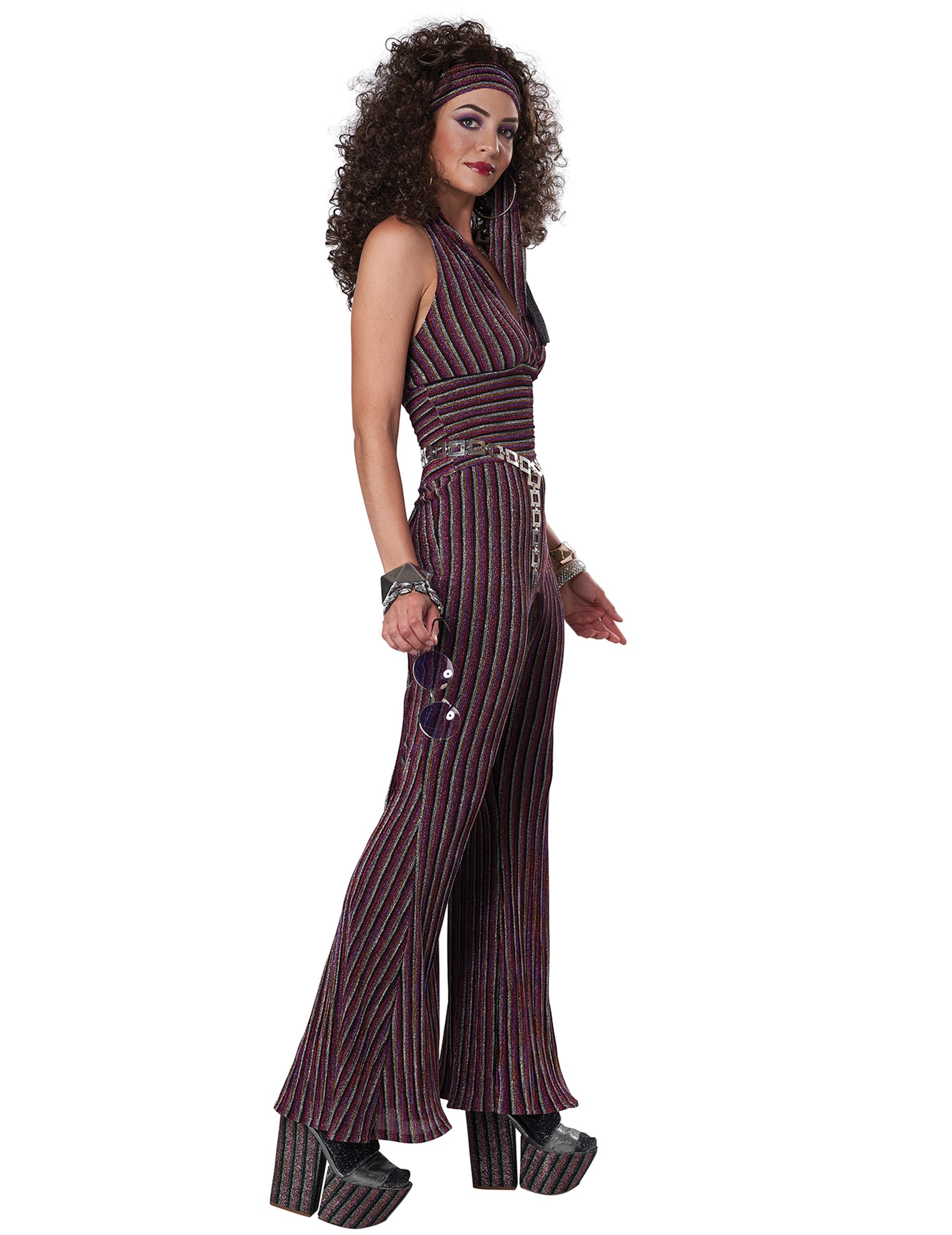 Dieses Disco-Queen-Kostüm für Damen besteht aus einem Oberteil, einer Hose und einem Haarband. Der Gürtel, die Schuhe, der Schmuck und die Brille sind nicht im Lieferumfang enthalten.
