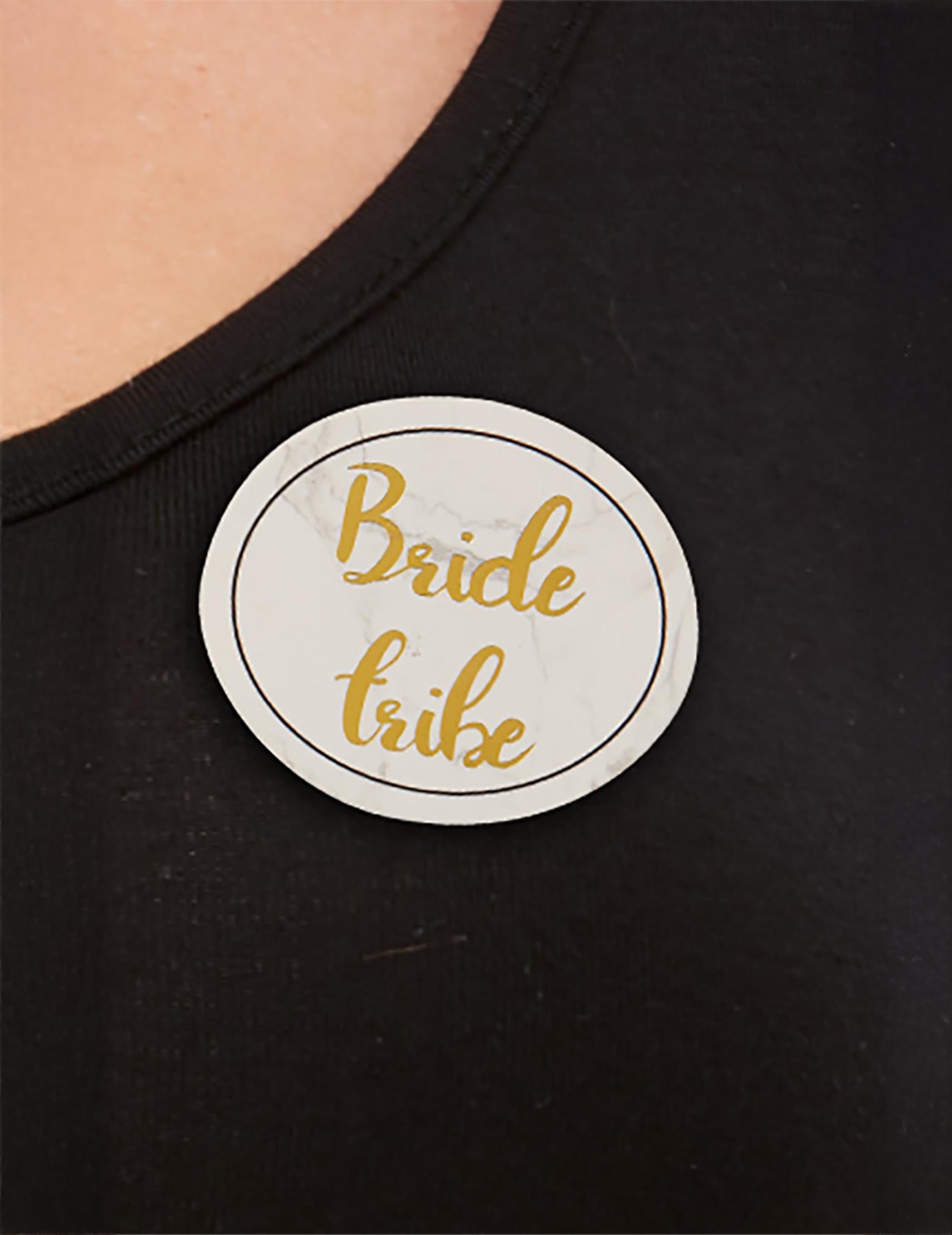 Diese Abzeichensind weiß und haben die Aufschrift in goldenen Buchstaben Bride to be auf einem und Bride Tribe auf den anderen vier.