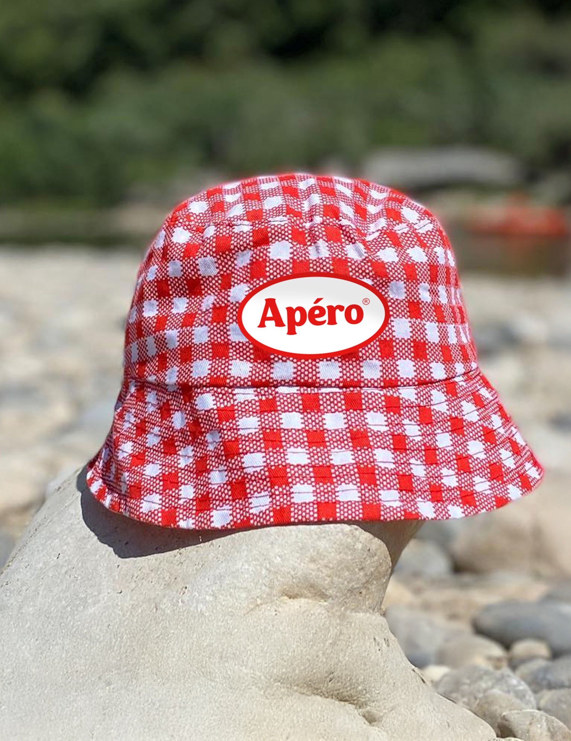 V tvare Bobon je na červené a biele dlaždiceNa ňom je nápis „Aperitív„červenými písmenami na žltom pozadí.“