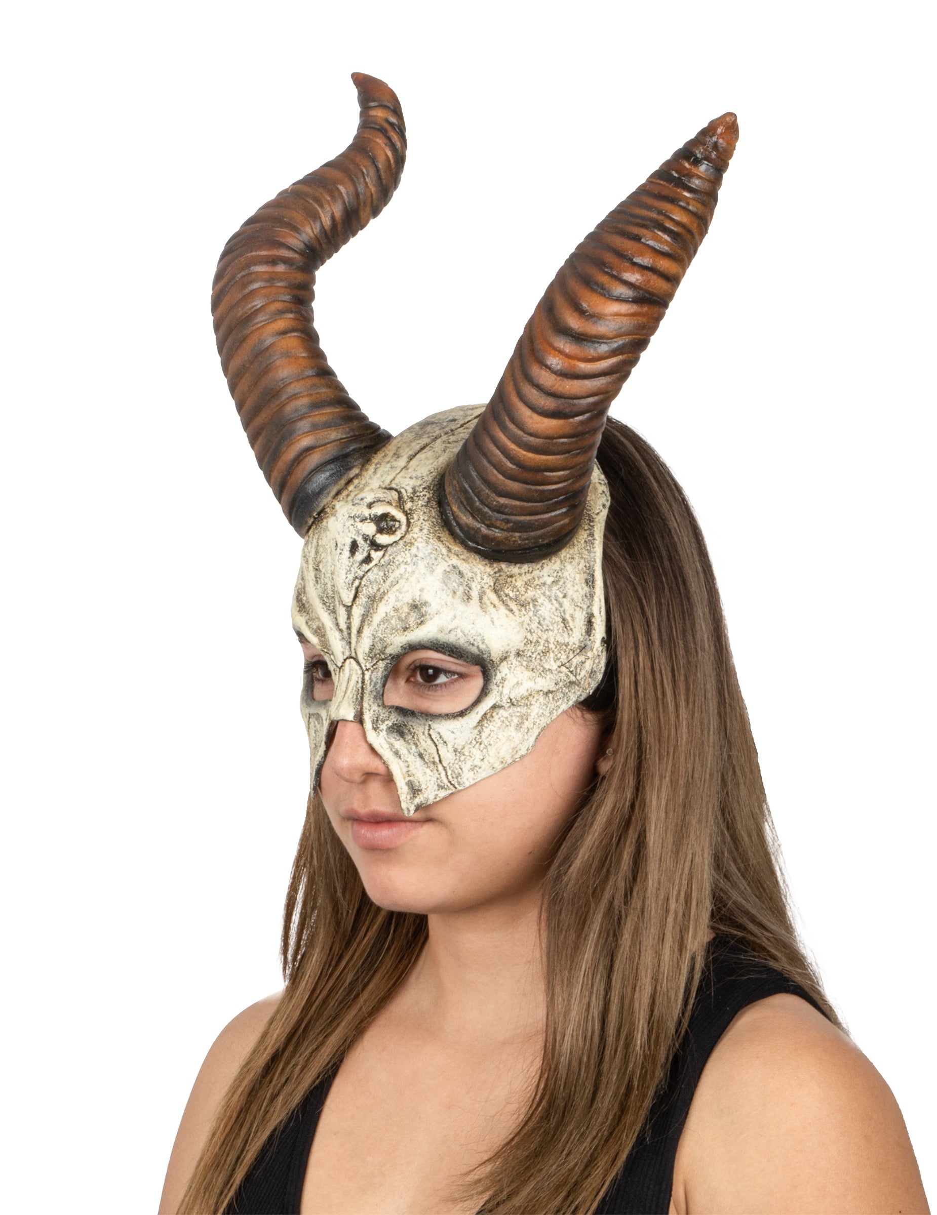 Die großen, gedrehten Hörner tragen zu seiner imposanten Erscheinung bei, während die Details der Risse seinen wilden und brutalen Aspekt verstärken. Seine Augenöffnungen ermöglichen eine gute Sicht, während die Intensität seines Blicks erhalten bleibt.