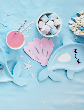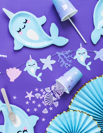6 assiettes en carton forme licorne des mers narval bleue 18,5 x 29 cm