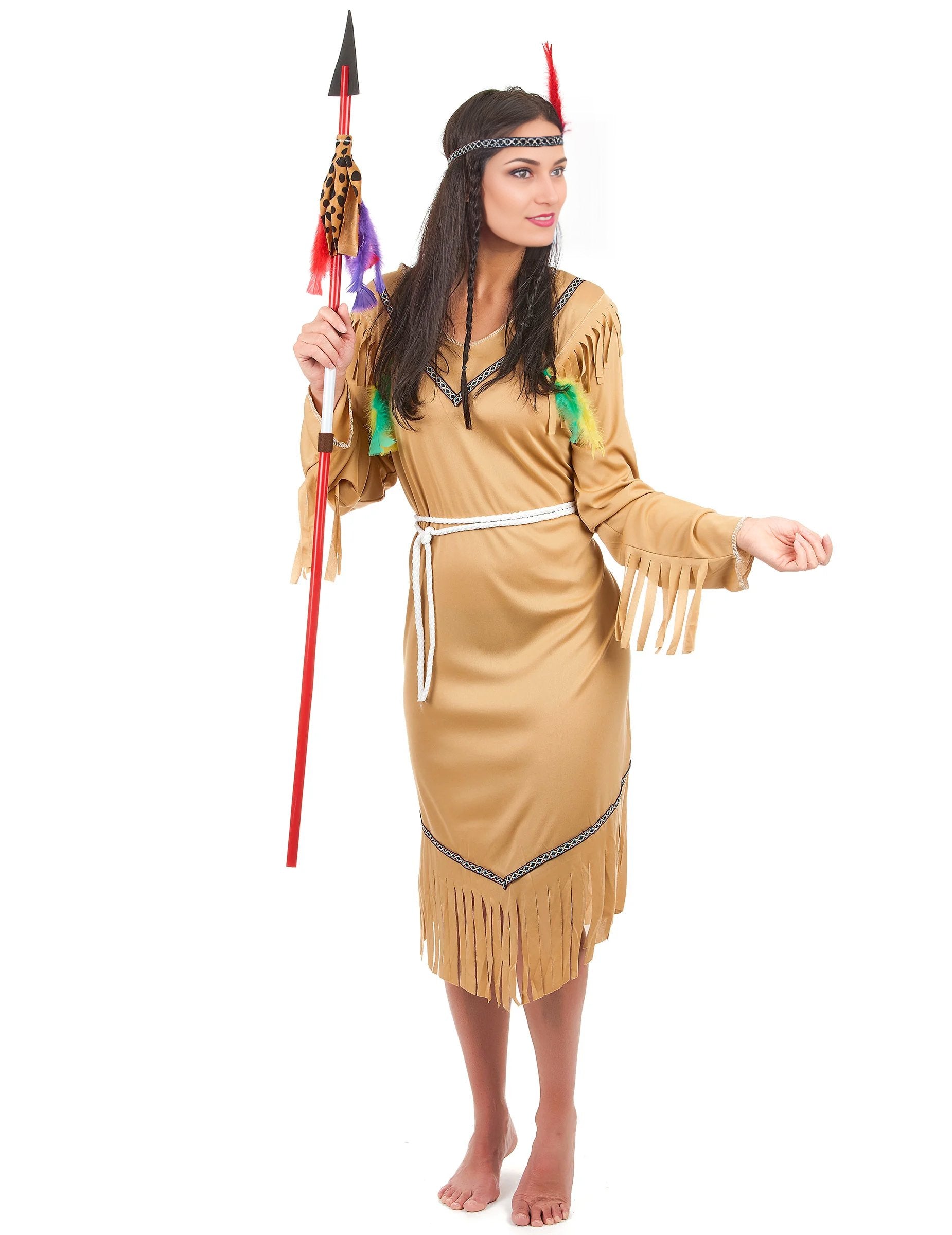 Tento bledý indický kostým se skládá ze šatů, opasku a čelenky (zbytek není součástí). Dlouhé šaty jsou béžové s třásněmi na rukávech, ramenou a spodním dílu. Na horní části oděvu jsou malá zelená a žlutá peříčka. Indická čelenka je elastická a zdobená červeným peřím. Velikost 40-42. Tento kostým je ideální pro vaše indické večírky nebo karneval.
