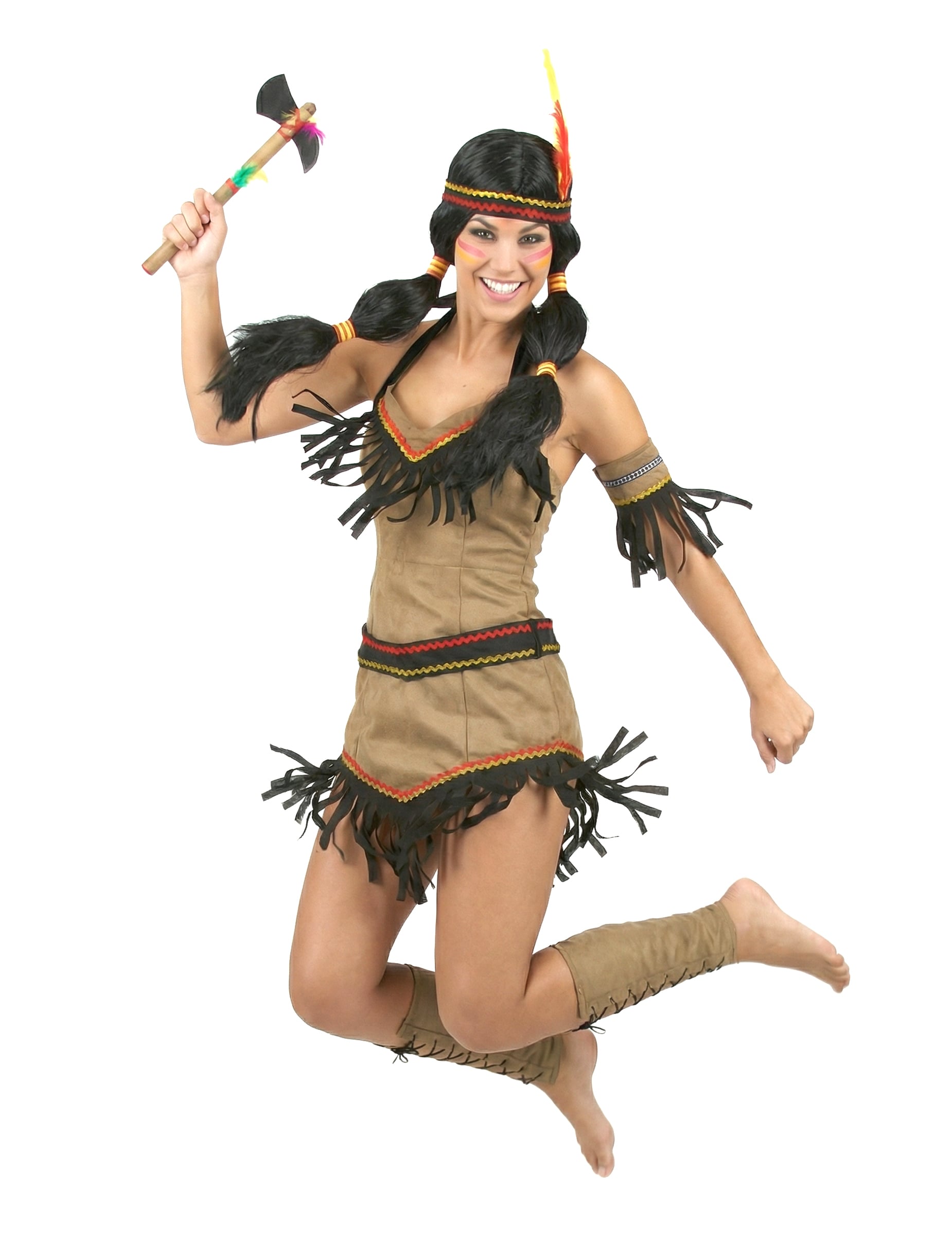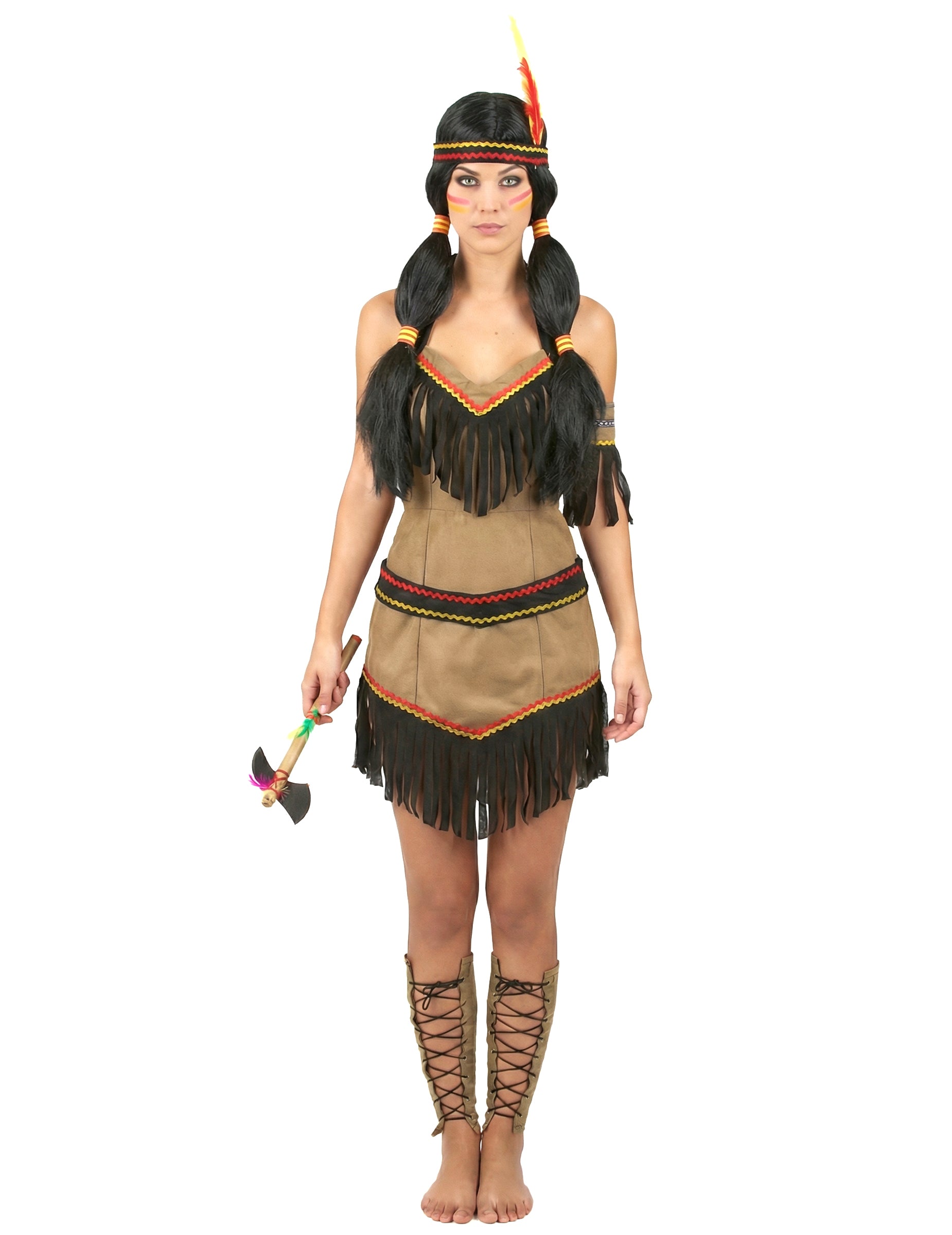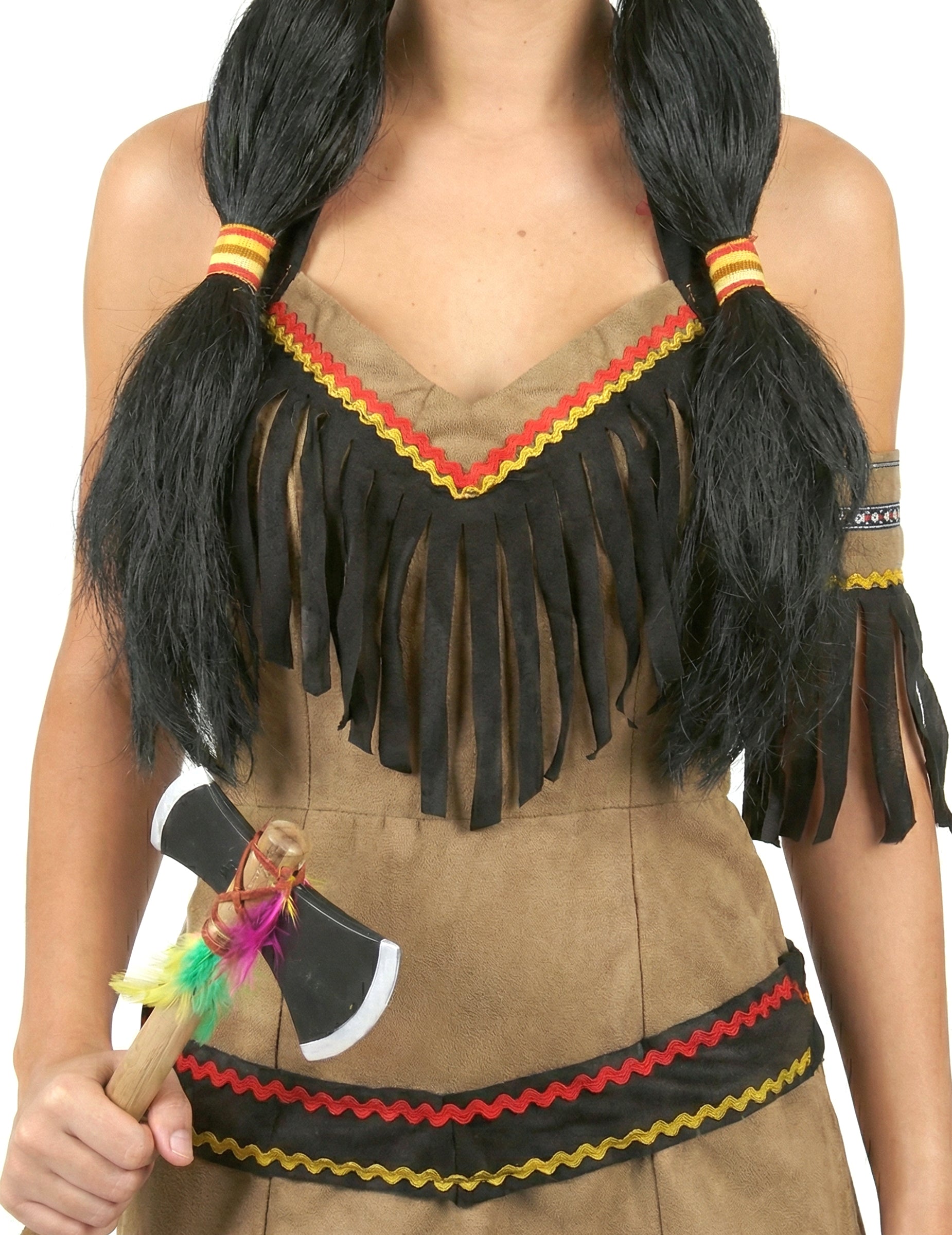 Šaty jsou vyrobeny z hnědé látky, která napodobuje typické oblečení ze zvířecí kůže američtí indiáni. Tyto elastické šaty se dokonale přizpůsobí tvaru vašeho těla a jsou zdobeny barevným lemováním a třásněmi pro 100% indický styl.