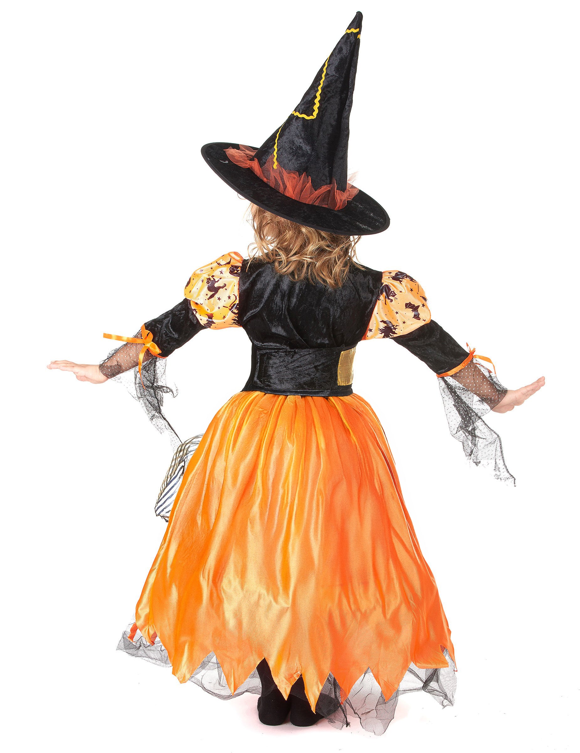 Tento halloweenský kostým čarodějnice je pro dívky a obsahuje šaty, pásek a klobouk. Šaty zdobí krásné černé halloweenské vzory na oranžovém pozadí. Tyl a imitace sametu se střídají a vytvářejí tak vysoce kvalitní efekt. Plastový kruh pod šaty dodá outfitu objem. Pásek na suchý zip stahuje pas. Je leskle zlatý s imitací šněrování vpředu. Klobouk, který ladí se zbytkem kostýmu, dodá outfitu eleganci. Tento vysoce kvalitní kostým bude perfektní pro to, aby se z vaší dcery stala ta nejkrásnější čarodějnice na Halloween!