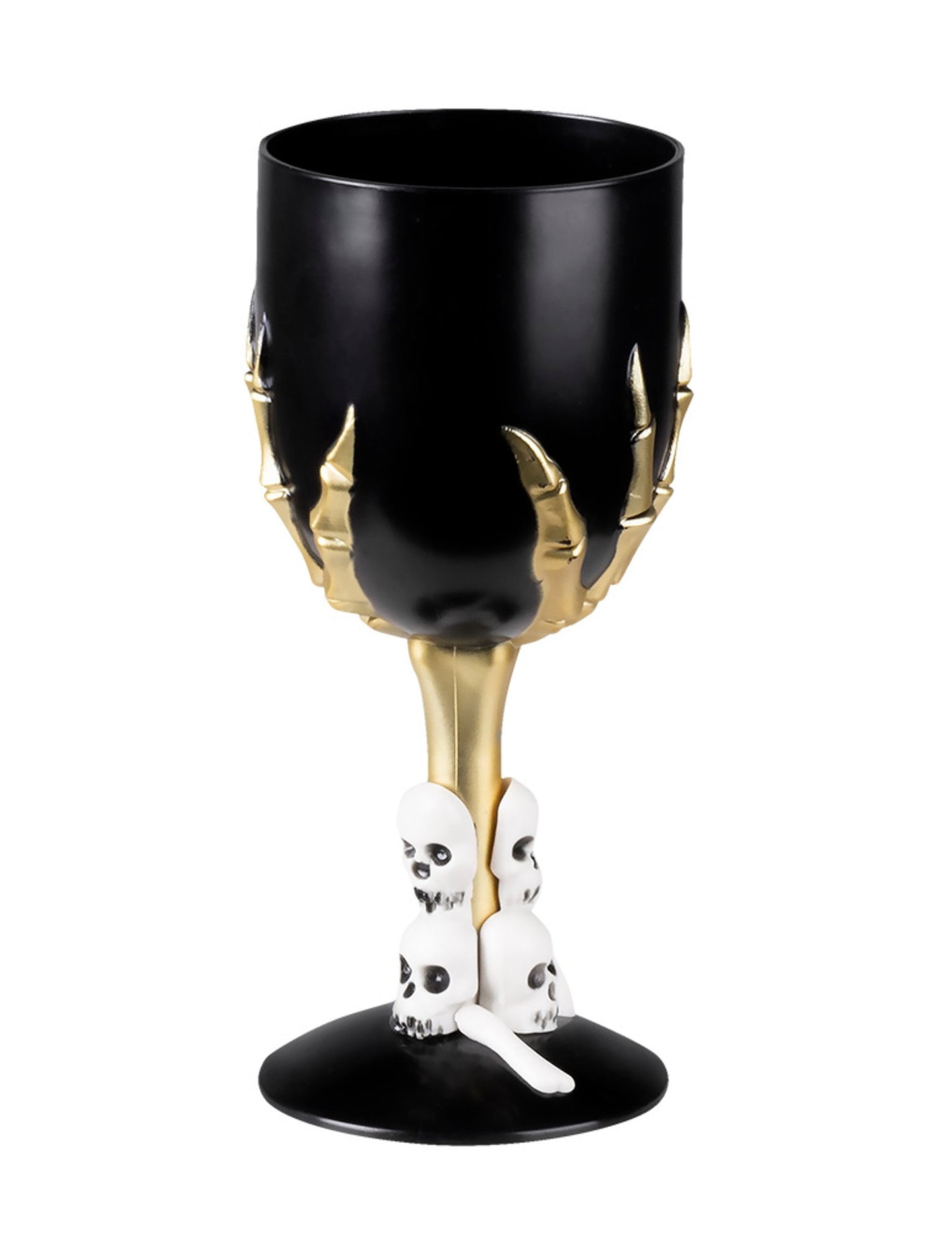 Tato černá halloweenská sklenice se zlatou stopkou je ideální pro strašidelné prostírání. Její kostnatá zlatá ruka svírá pohár, zatímco malé bílé lebky zdobí dno, což umocňuje zlověstného ducha designu. Použijte ji jako prezentační předmět nebo k pronesení přípitku v atmosféře hodné té nejtemnější hostiny. Jedinečný předmět, který doplní vaši slavnostní prostírání.