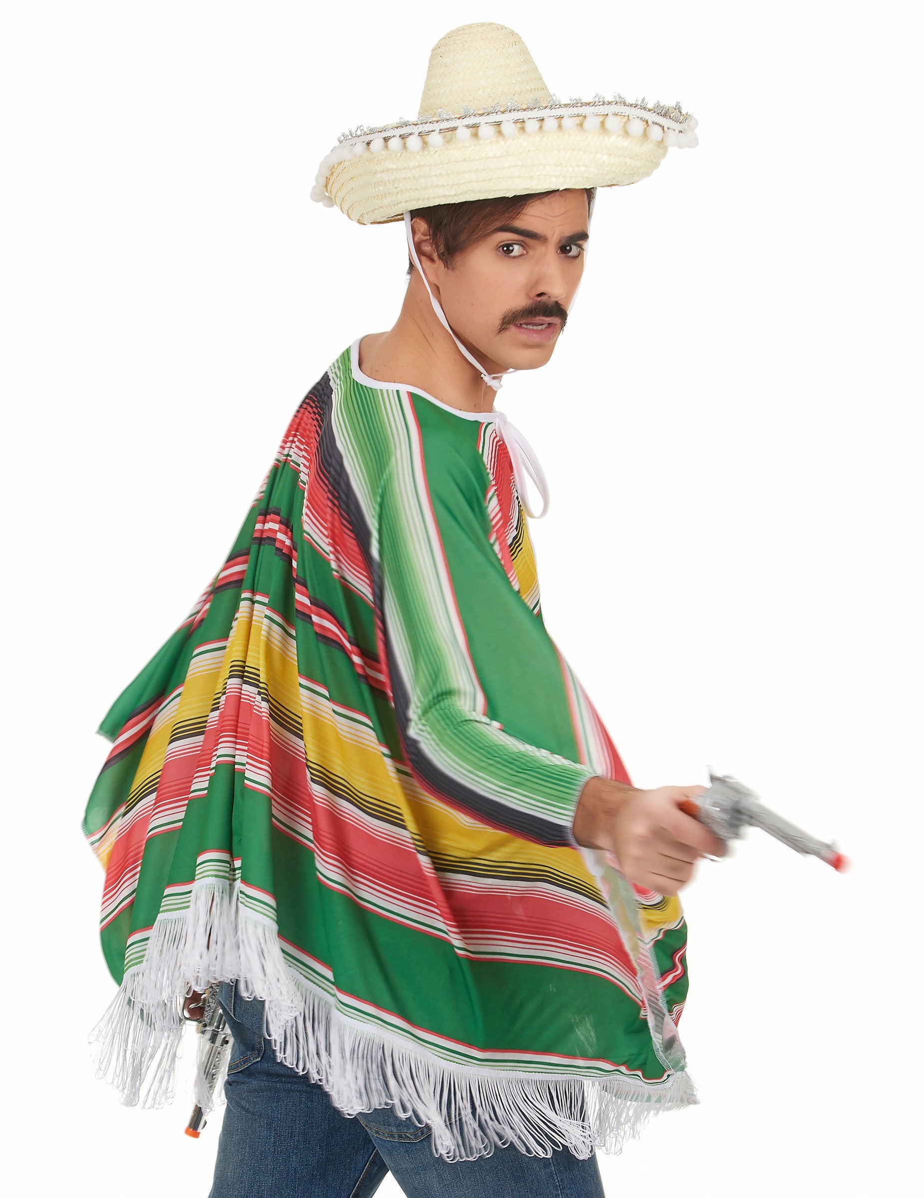 Mexické přestrojení pro muže, kteří se skládají z poncho a sombrera. Poncho v barvách Mexika je pruhovaná zelená, černá, červená, bílá a žlutá, má bílé okraje. Poncho měří vysoko 94 cm. Sombrero barevná sláma je ohraničena malými bílými kuličkami. Tato velikost malá, má hlavové kolo asi 56 cm (kalhoty a boty nejsou zahrnuty). Toto přestrojení je ideální pro vaše tematické večery, pro show nebo jakoukoli maskovanou událost.