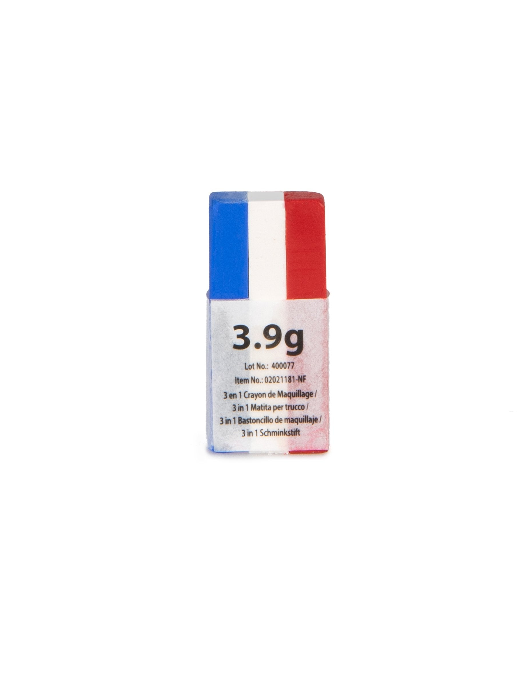 Tato 3v1 tužka na líčení je v barvách Francie. Najdete v ní 3 x 1,3 gramu make-upu. Tato tříbarevná tužka na líčení je dodávána v tyčince, která vám umožní snadno a rovnoměrně nanášet barvy francouzské vlajky: modrou, bílou, červenou. Tato tříbarevná tužka v tyčince bude ideální pro podporu vašeho týmu během sportovních soutěží, jako je mistrovství světa ve fotbale nebo tenisový turnaj, nebo dokonce i pro státní svátek 14. července! Složení: Ricinus communis seed oil (olej ze semen ricinus), mastek, cera alba (bělá cibule), candelilla cera (kapřišnice), paraffinum liquidum (liquidum), sorbitan laurát, fenoxyethanol, kyselina sorbová, tokoferol. (+/-): CI77891, CI15850, CI73360, CI77007.