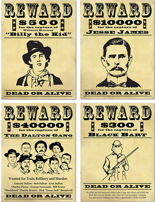 Sada 4 plakátů ocenění na nalezení mrtvých nebo živých banditů. Měří 48,3 cm a budou ideální pro zdobení vašeho pokoje na téma západního západu.