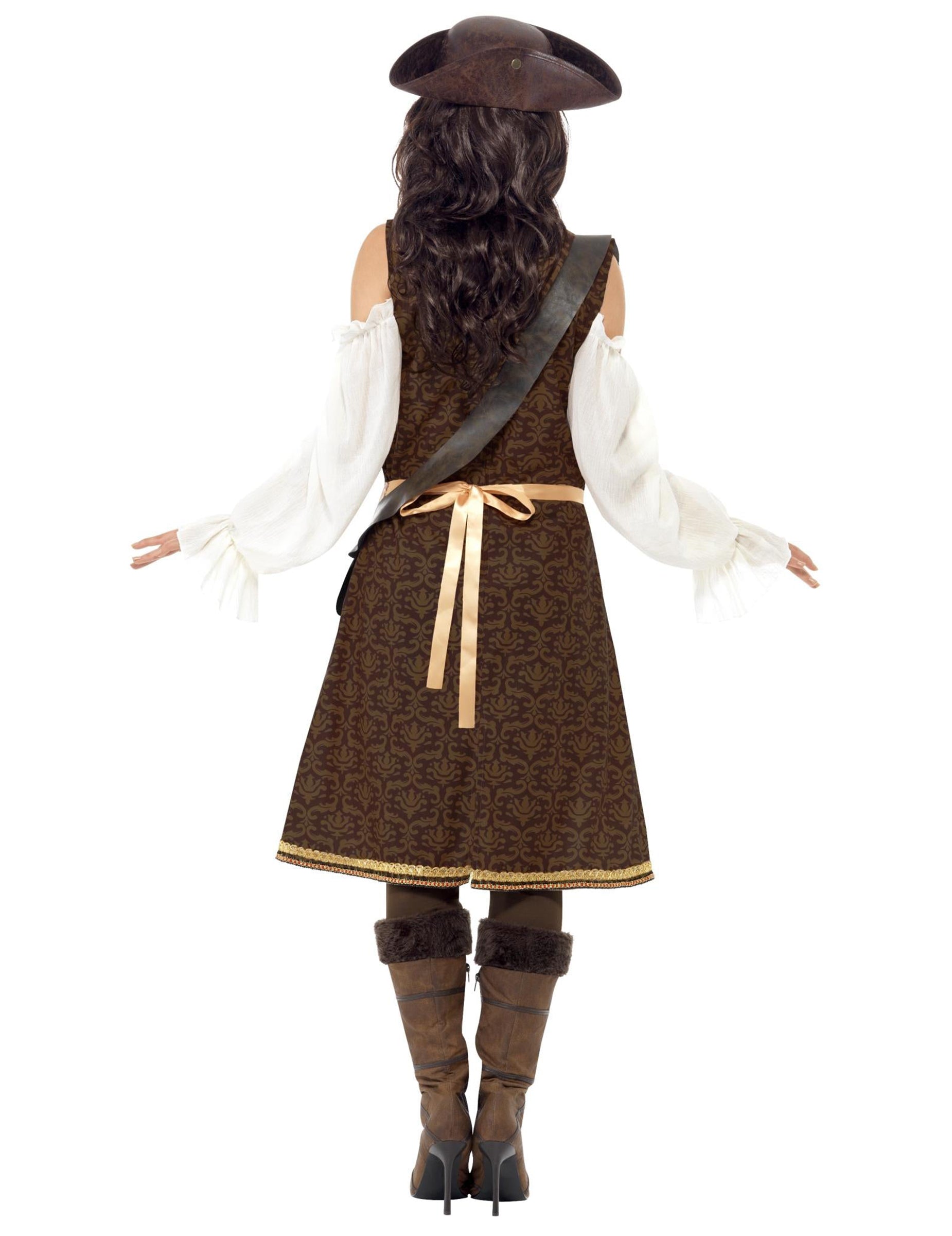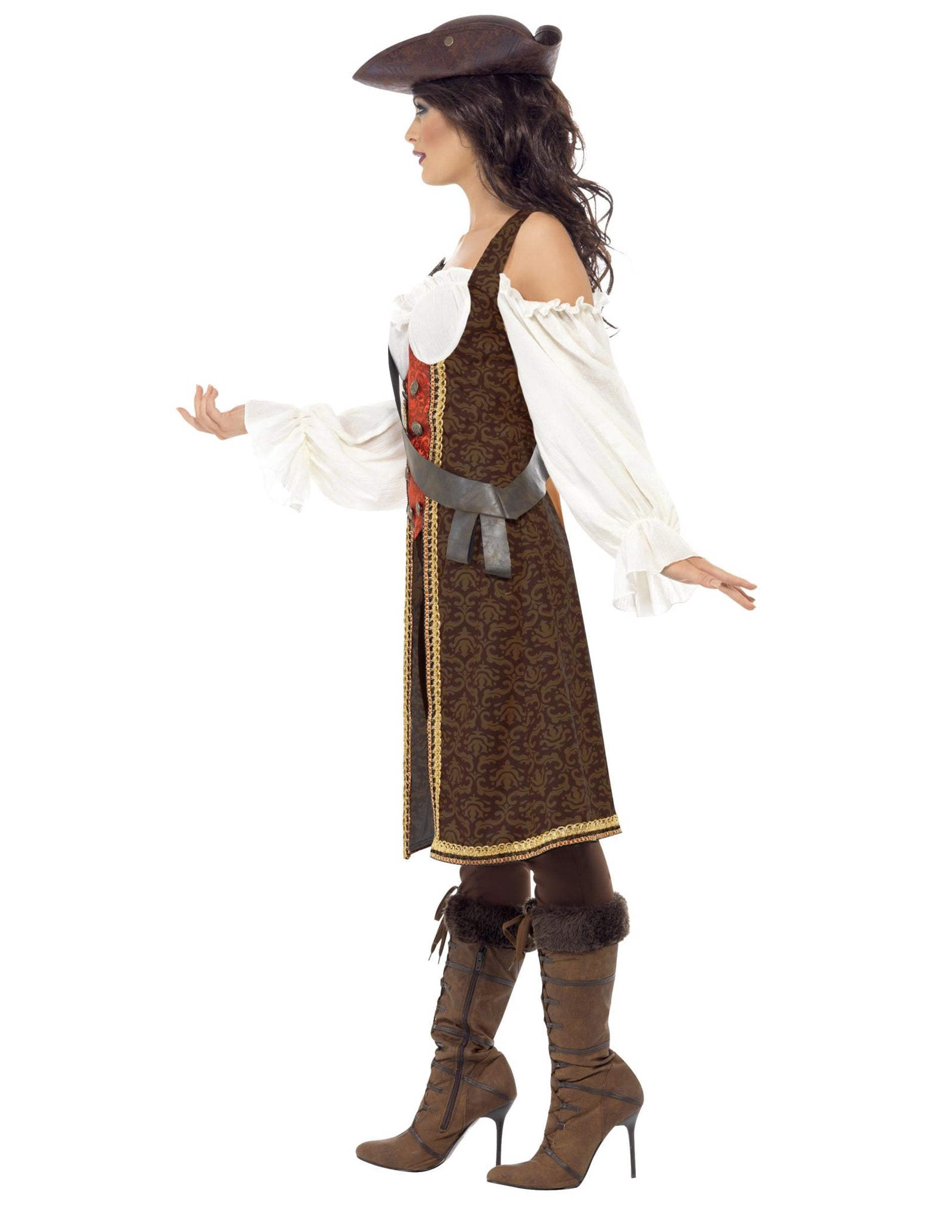Toto pirátské převlečení pro ženy se skládá z top, kalhot a postroje. Vrchol se skládá z několika částí všech šitých. Falešná bílá halenka ustupuje dlouhým rukávům a přední části. Červený bustier je umístěn níže s hnědými knoflíky. Dlouhá bunda s hnědým a béžovým vzorem a zlatým okrajem dokončí tento vrchol, který se snadno nasadí pomocí zipu. Elastické kalhoty jsou dlouhé a hnědé barvy. Tmavě hnědý postroj bude připojen díky pásu a bude vaše zbraně udržovat. Bude to perfektní během maskovaného večera nebo karnevalu.