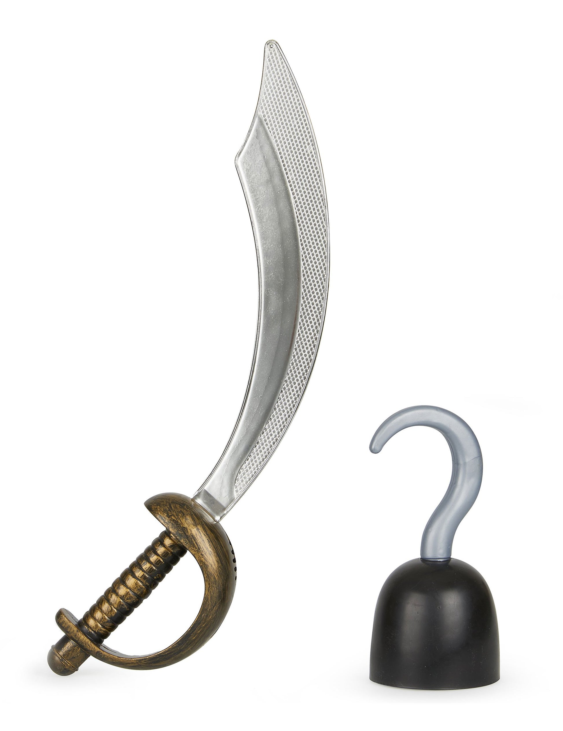 Tato sada se skládá z háku a pirátské šavle. Oba doplňky jsou vyrobeny z plastu a šavle měří přibližně 50 cm na délku. Šavle má stříbrnou barvu a zlatou rukojeť. Háček je v černé a šedé barvě. Tyto doplňky jsou ideální jako doplněk k vašemu pirátskému kostýmu na kostýmní večírky nebo karnevaly.