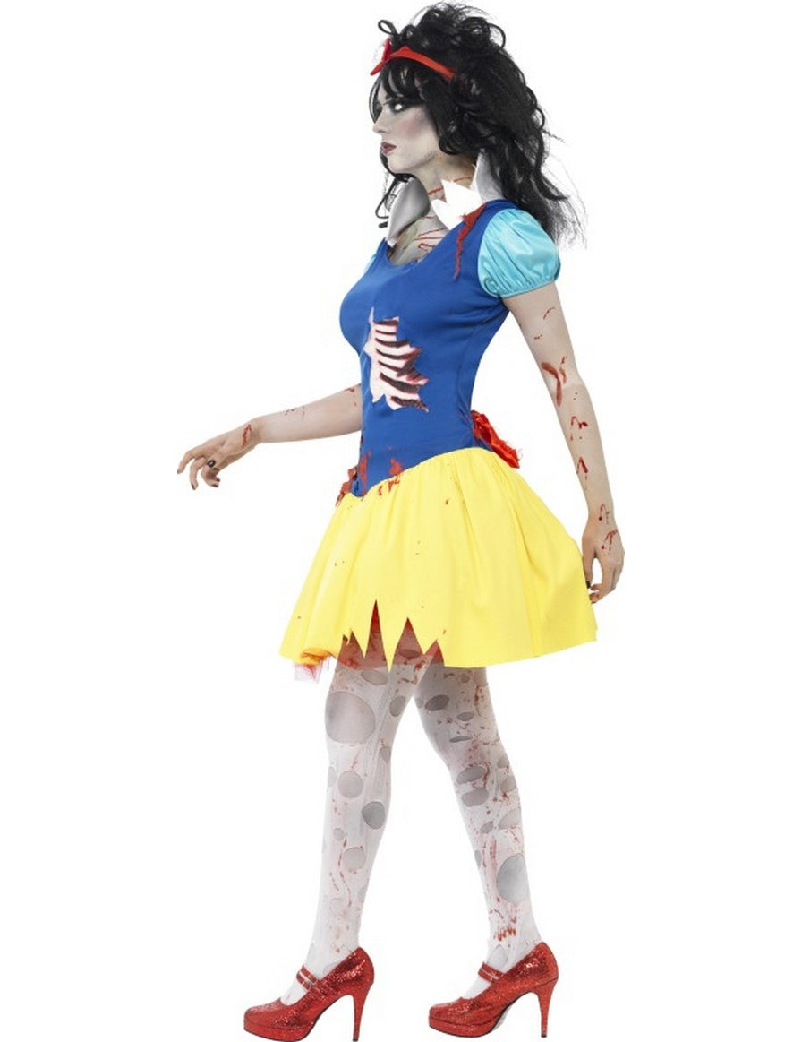 Ce déguisement de zombie de princesse de conte de fées pour femme se compose d'une robe et d'un serre-tête (collants et chaussures non inclus). Le haut de la robe est bleu, maculé de tâches de faux sang. Les manches courtes bouffantes sont élastiques. Un large col rigide blanc vient encadrer votre visage. Sur le buste, le dessin d'un trognon de pomme est imprimé avec le message "bite me". Une ouverture est également présente sur le côté. Elle laisse apparaître une pièce en latex, qui représente les côtes et les muscles écorchés du zombie. Deux liens satinés rouges sont cousus sur les côtés. Ils se nouent dans le dos et permettent de cintrer la robe. Le bas de la robe est jaune, tâché de faux sang. Des jupons de tulle rouge apportent du volume à la robe. Un serre-tête décoré d'un noeud rouge vient compléter le déguisement. Ce costume sera parfait pour vous transformer en princesse mort-vivante à l'occasion d'une zombie walk ou pour fêter Halloween.